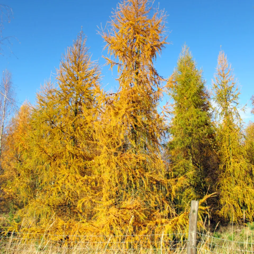 Ursprünglich ist die eher anspruchslose, aber lichtbedürftige Europäische Lärche (Larix decidua) ein Baum der Mittel- und Hochgebirge. Sie kann in Höhen von 2 500 Metern die Baumgrenze bilden. Im Laufe der Jahrhunderte ist sie in die Täler gewandert, in den Mischwald. Und inzwischen ist sie sogar in Städten zu finden. In Deutschland nimmt die Lärche nur ein Prozent der Waldfläche ein. Als einzige heimische Nadelbaumart zeigt sie eine leuchtend goldgelbe Herbstfärbung und wirft dann ihre Nadeln ab. Eine eindeutige Erklärung dafür gibt es nicht. Sicher ist, dass es der Lärche hilft, extreme Kälte und Trockenheit zu überstehen. Nadellos verträgt sie Temperaturen bis minus 40 Grad Celsius.