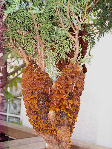 Mehr zum Krankheitsbild des Birnengitterrosts zu den anfälligen Wacholderarten und -sorten unter Birnengitterrost – jetzt auch an Früchten.