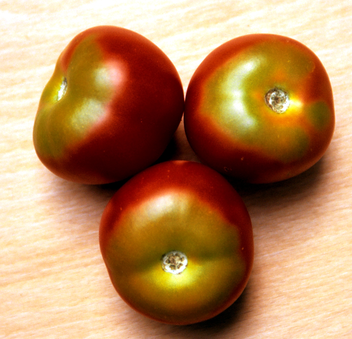 Am Stielansatz roter Tomatenfrüchte bildet sich ein grüner bis gelblicher Ring. Das Fruchtfleisch darunter ist verhärtet. Die Symptome treten verstärkt an den obersten Fruchttrauben auf. Begünstigend wirken ein starkes Überhitzen der Fruchtoberfläche und eine intensive Lichteinwirkung. Auch ein Überangebot an Stickstoff bei gleichzeitigem Mangel an Kali und Phosphor fördert die Schäden.