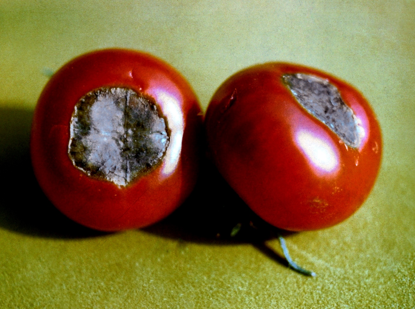 An den Ansatzstellen der Blüte entstehen auf den Früchten wässrig-graue bis braune, eingesunkene Flecken, die teilweise im Inneren zum gesunden Gewebe scharf abgegrenzt sind. Die Schäden können zwar an allen Früchten der Trauben auftreten, doch sind davon besonders die unteren Trauben betroffen. Ursache ist ein gestörter Kalzium-Stoffwechsel. Begünstigt werden die Schäden durch eine zu hohe Salzkonzentration im Boden und durch eine ungleichmäßige Wasserversorgung. Gefährdet sind vor allem stark wachsende Pflanzen auf sandigen Böden.