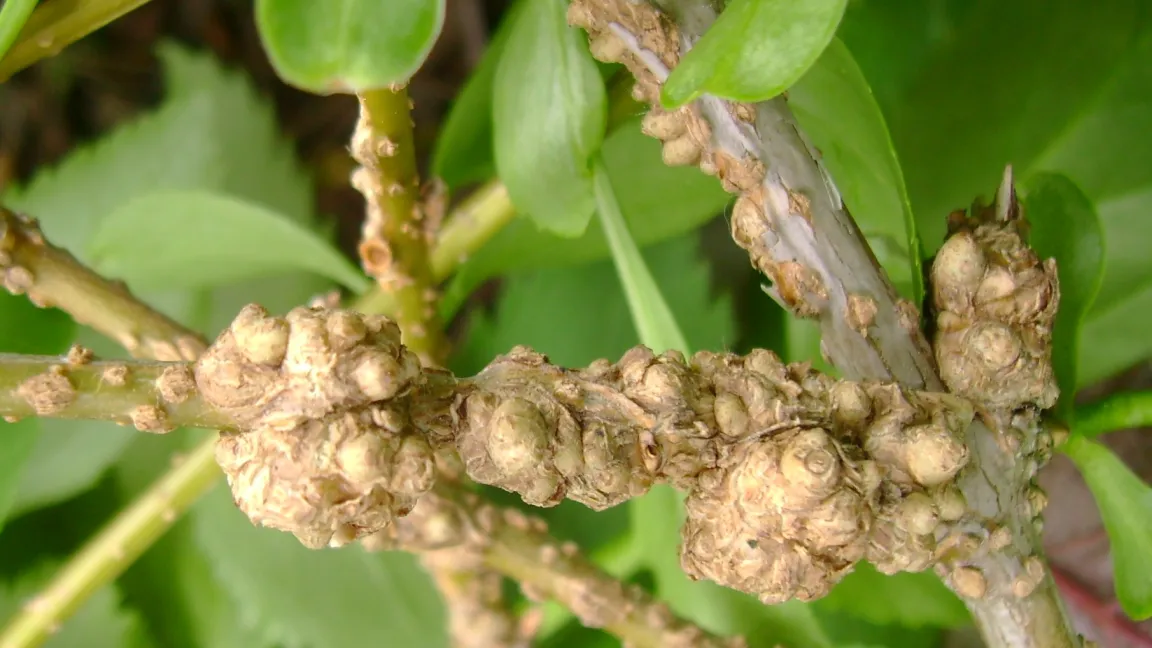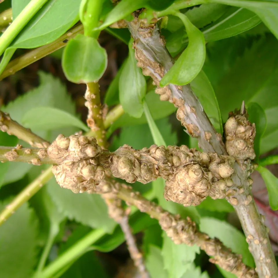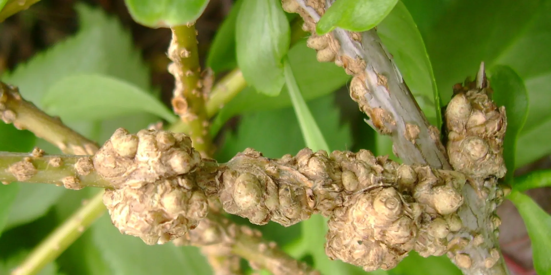 An den Zweigen treten stark zerklüftete, verholzte, mehrere Zentimeter große Wucherungen auf. Oft sehen sie aus wie ein Knäuel von Wurzelansätzen. Ist der Befall stark, fallen Laubaustrieb und Blütenbildung bescheiden aus. Teilweise sterben die Zweige sogar oberhalb der Befallsstellen ab. Gehölze an sehr schattigen Standorten und solche, die mangels Schnitt sehr dicht sind, zeigen verstärkt Zweiggallen. Erhöhte Infektionsgefahr besteht auch an Standorten mit hoher Luftfeuchte und bei bodennahen Trieben. Verursacher sind der Erreger Corynebacterium fascians und nach Angaben aus den USA auch Agrobacterium tumefaciens.
