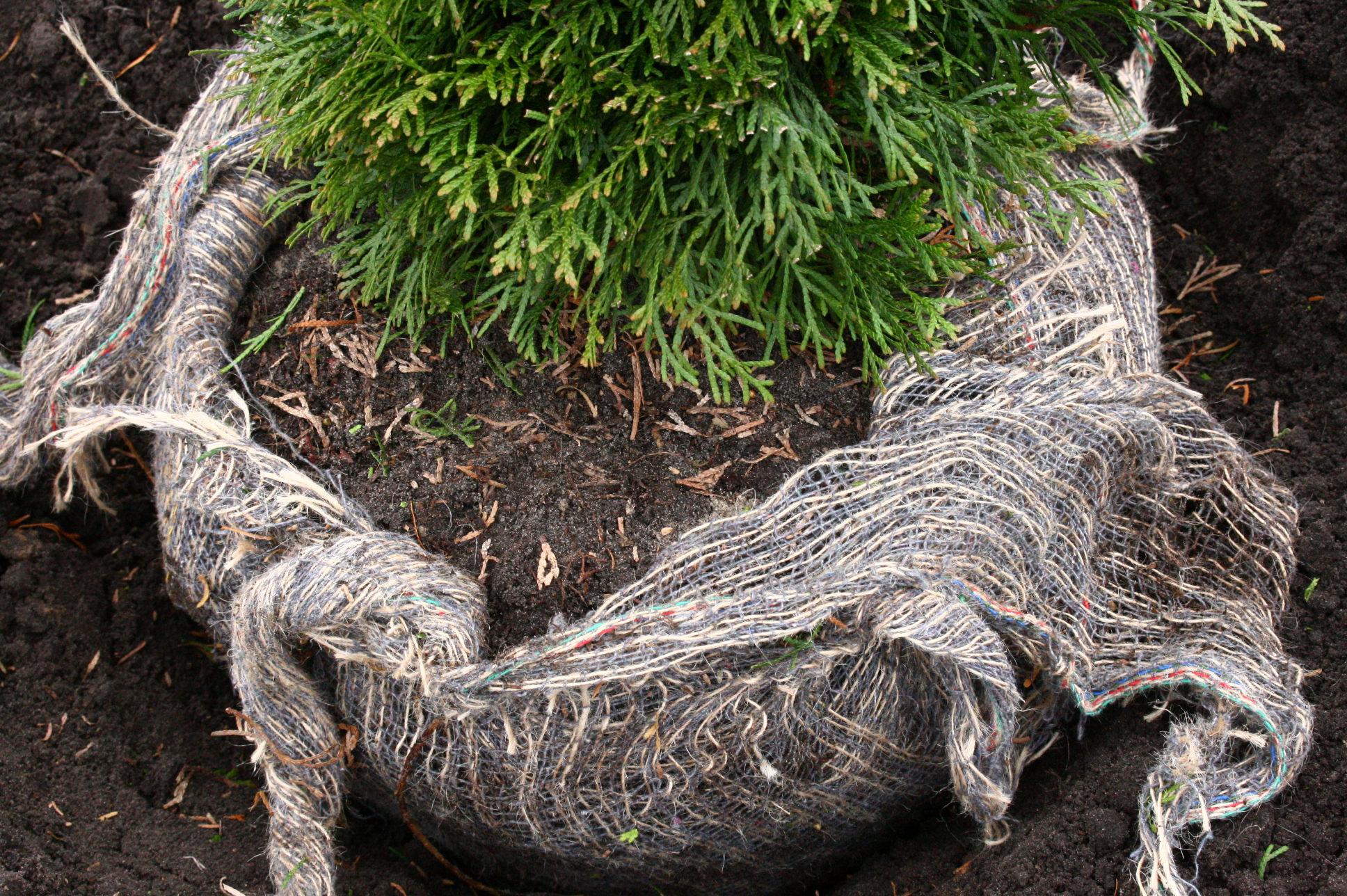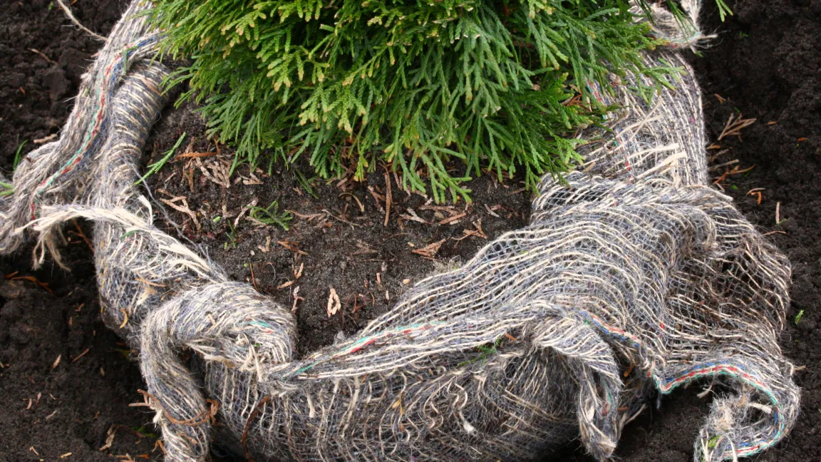 Pflanzen, die aus dem Boden gestochen wurden, besitzen ein Ballentuch aus Jutefaser und sehr große Exemplare auch noch zusätzlich einen Drahtkorb. Gelegentlich wird empfohlen, dieses Tuch vor der Pflanzung zu entfernen und manchmal sogar, die Erde aus dem Ballen auszuspülen. Das ist aber Praxiserfahrungen zufolge nicht zu empfehlen, sondern das Ballentuch sollte lediglich um den Wurzelhals beziehungsweise die Stammbasis herum gelockert werden, das heißt aufgeknotet oder aufgeschnitten. Das Jutegewebe und auch der Eisendraht verrotten mit der Zeit im Boden und bieten den Wurzeln kein dauerhaftes Hindernis. Lediglich Kunststofftöpfe müssen selbstverständlich entfernt und entsorgt werden.
