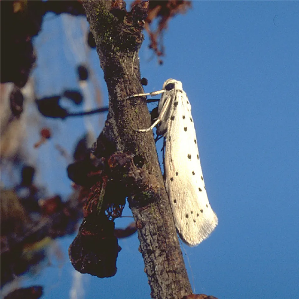 Oft sind es die Blätter und Zweige ungepflegter Apfelbäume, die mit einem weißen Gewebe verpackt zu sein scheinen. Die watteartigen Überzüge können aber auch an vielen anderen Bäumen beobachtet werden, beispielsweise am Weißdorn. Bei starkem Befall in trockenen, warmen Sommern können Gehölze ganz von den Gespinsten überzogen sein. Die Familie der Gespinstmotten, die zu den Schmetterlingen gehört, ist mit mehreren Gattungen und etwa 50 Arten in Mitteleuropa vertreten. Ihre Larven bleiben längere Zeit gruppenweise zusammen (Raupennester), eingehüllt in gemeinsame Fraßgespinste. Wenn der Nahrungsbedarf der einzelnen Individuen größer wird, zerstreuen sich die Larven. Dann ist weitgehender Kahlfraß nicht mehr ausgeschlossen. Die eher unscheinbaren Falter haben im Ruhezustand dachziegelartige Flügel mit dunklen Punkten auf weißem Grund. Selten übersteigt die Flügelspannweite 20 Millimeter.