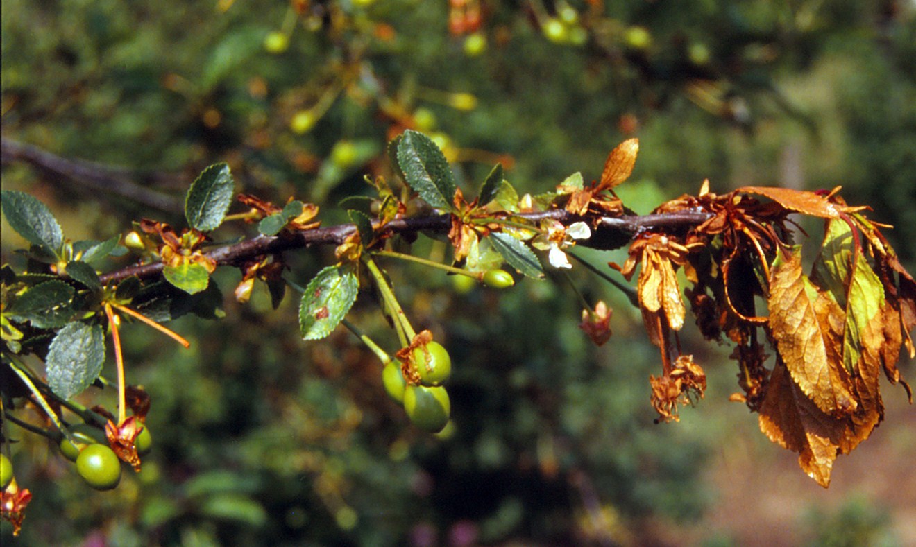 Wenn während der Kirschblüte feuchtkühle Witterung herrscht, ist damit zu rechnen, dass die Monilia-Spitzendürre verstärkt auftritt. Sie befällt Sauerkirschen, insbesondere der Sorte „Schattenmorelle“, Süßkirschen, Aprikosen und zahlreiche Ziergehölze aus der Gattung Prunus. Kurz vor und während der Blüte infiziert die Pilzkrankheit zunächst die Blütenorgane. Von hier kann der Erreger dann in die Triebe eindringen. Befallene Blüten und Blätter welken und verbräunen innerhalb weniger Tage. Sie fangen von der Spitze her an abzusterben, sehen wie verdorrt aus (Spitzendürre) und fallen nicht ab, sondern bleiben als braun verfärbte Büschel am Trieb hängen. Die Bekämpfung besteht in erster Linie im Herausschneiden der befallenen Triebe bis 20 Zentimeter tief ins gesunde Holz. Wo in den vergangenen Jahren verstärkt Monilia-Spitzendürre aufgetreten ist, kann eine Bekämpfung mit zugelassenen Präparaten sinnvoll sein. Dies gilt insbesondere bei nasskalten Witterungsverhältnissen während der Blüte.