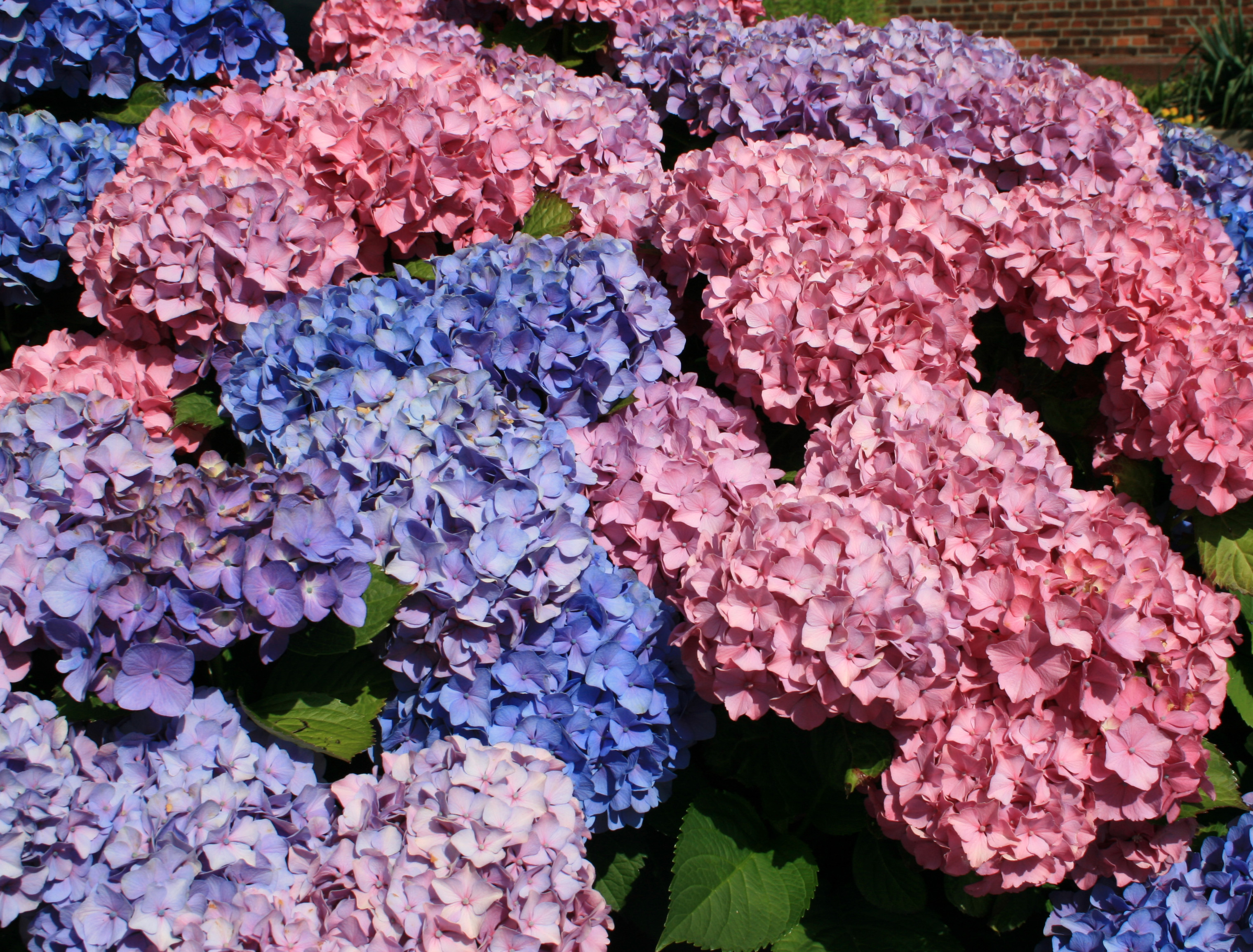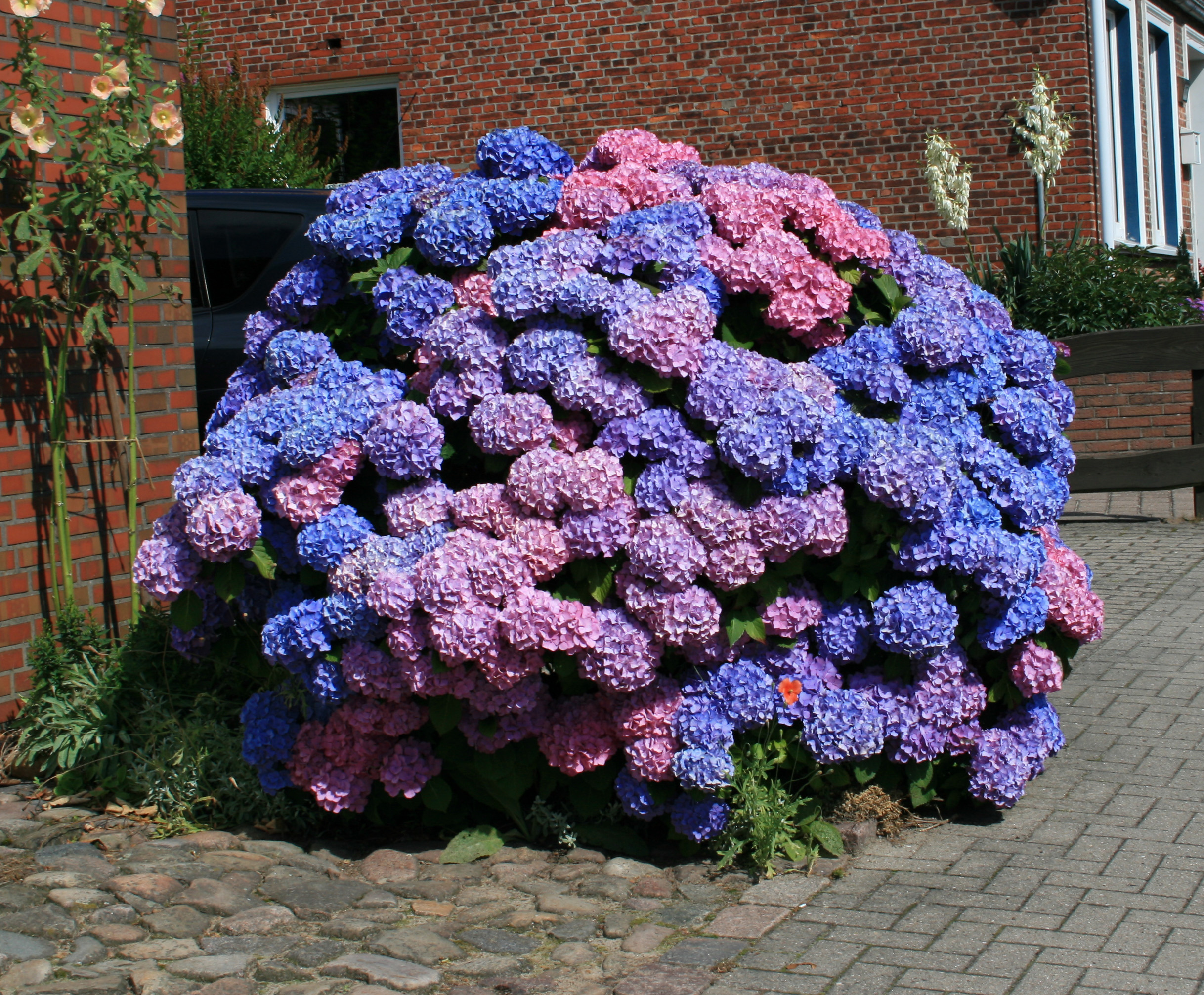 Eine Besonderheit der Hortensien ist, dass die Blütenfarbe beeinflussbar ist. Rosafarbene Blüten färben sich in saurem Milieu mit einem pH-Wert von 4,0 bis etwa 5,0 und einem hohem Aluminium-Gehalt nach und nach blau. Unterstützend wirken beispielsweise nährstoffreiche Rhododendron-Erde und kalkarmes Wasser, denn Rhododendren haben ähnliche Standortvorlieben wie Hortensien. Kalkhaltiges Wasser lässt den pH-Wert ansteigen. Eine Düngergabe im Frühjahr und Blaufärbemittel aus dem Fachhandel lassen blaue Wunder wahr werden. Will man das Blütenblau erhalten, muss man immer wieder nachhelfen, denn sonst verblasst die Farbe wieder.