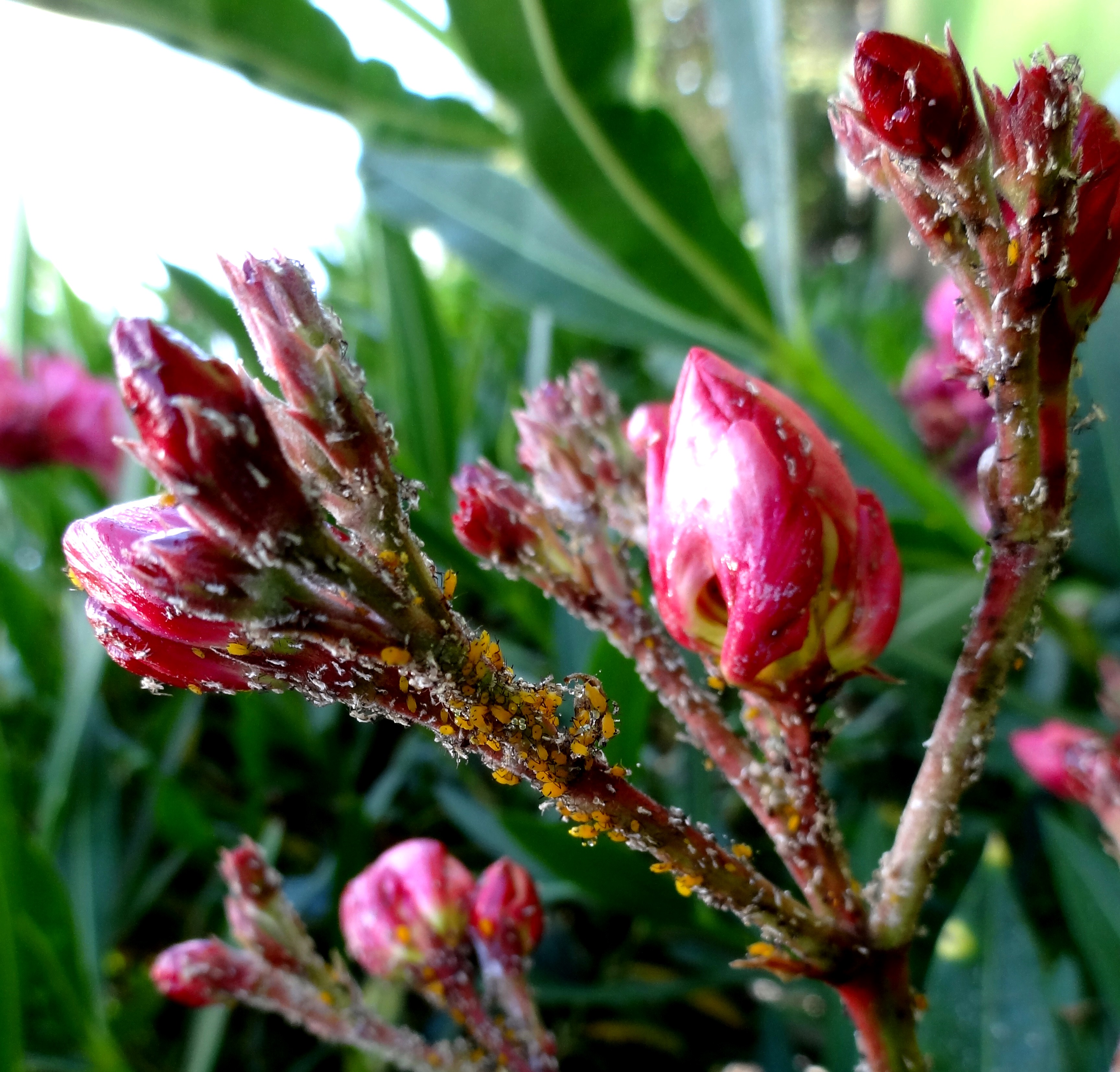 Vor allem an den Triebspitzen und Blütenständen, später auch auf den Blattunterseiten ist seit einigen Jahren die gelb und schwarz gefärbte Oleanderblattlaus – Aphis nerii (gelber Körper, dunkle Fühler und Beine sowie schwarze Siphonen) – in oft größeren Kolonien zu finden. Die erwachsenen, etwa 2,5 Millimeter großen, meist ungeflügelten Blattläuse sind lebendgebärend und vermehren sich durch Jungfernzeugung (Parthenogenese). Dies führt zu einer hohen Fruchtbarkeit und kurzen Generationsfolge. Dadurch bilden sich schnell große Kolonien auf den Pflanzen. Bei Überbevölkerung bilden sich auch geflügelte Tiere aus, die auf andere Pflanzen migrieren. Durch die Saugtätigkeit an den Triebspitzenblättern verkrüppeln diese und der Wuchs wird gehemmt. Außerdem werden große Mengen Honigtau produziert. Der Honigtau und die sich darauf ansiedelnden Rußtaupilze beeinträchtigen das Wachstum und mindern den Schmuckwert der Pflanzen zusätzlich.