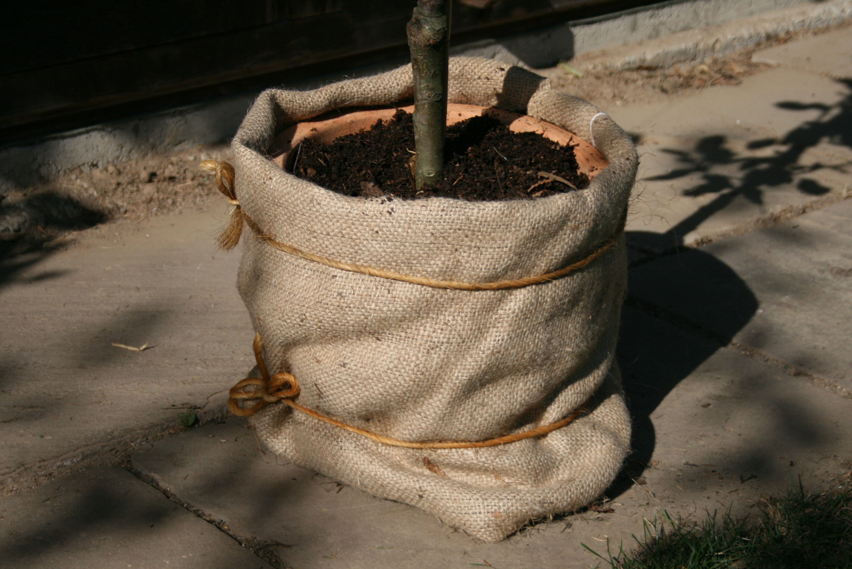 Der einfachste Schutz für frostharte Kübelpflanzen ist daher, sie an einer möglichst windgeschützten und schattigen Stelle im Garten über den Winter in den Boden einzusenken. Wenn kein Garten vorhanden ist, sollte der Topf möglichst dick mit wärmeisolierendem Material umwickelt werden, zum Beispiel Jutestoff, Noppenfolie oder Vlies. Schon 1 Zentimeter Dicke nützt etwas, aber je dicker die Schicht ist, desto besser.