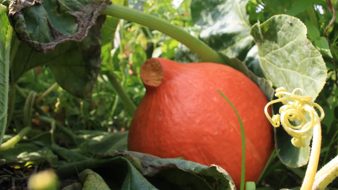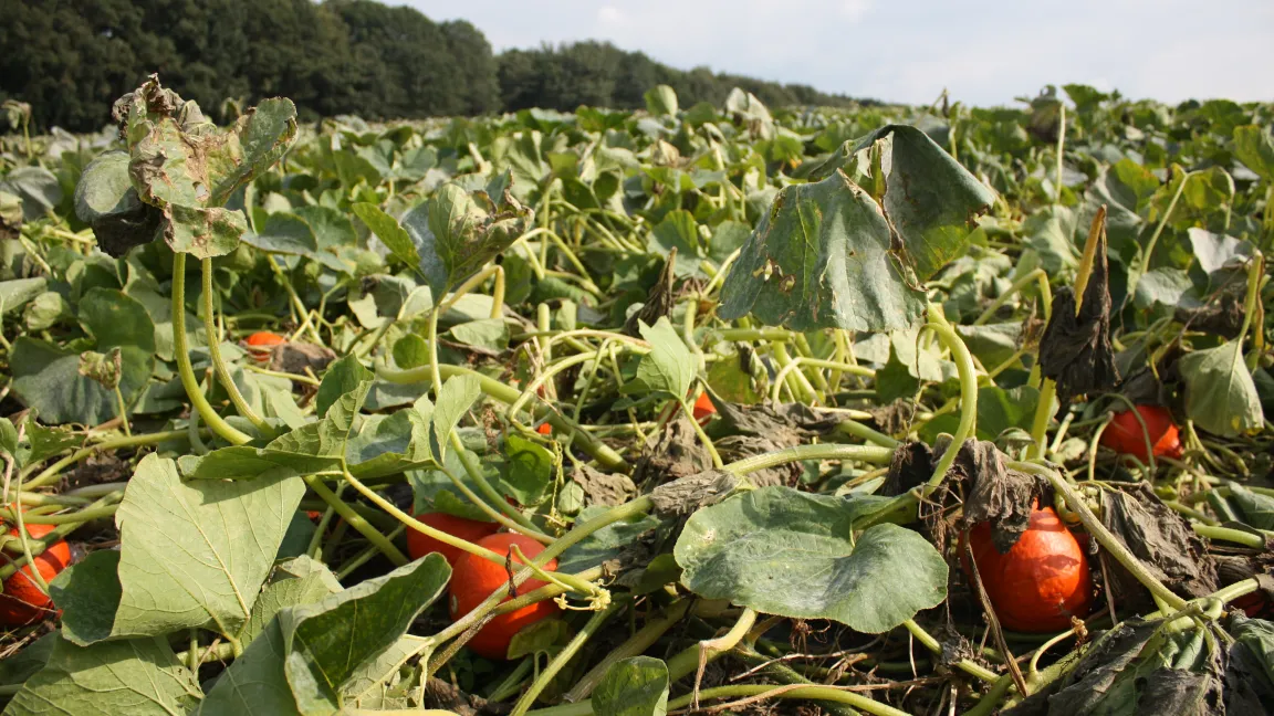 Auf der Kürbisfläche der Familie Lynders schlug der Falsche Mehltau (Pseudoperonospora Cubensis) zu. Doch die pilzliche Krankheit kommt um diese Zeit nicht einmal ungelegen. Lynders hofft, dass sich das Pilzgeflecht auf den Blättern zügig ausbreitet und sie absterben lässt. Dann erst kann die Sonne direkt auf die Kürbisse scheinen. Das wäre genau das Richtige, denn Speisekürbisse brauchen einen sonnigen Herbst, damit die Frucht besser abreifen kann. Der Landwirt bleibt gelassen. Er möchte seinen Bestand möglichst bis Halloween am 31. Oktober nach und nach abernten. So erhalten die Kunden immer frische und reife Ware. Vorausgesetzt die Sonne spielt mit.