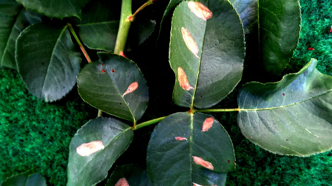 Bei einem Befall mit der Rosenblattminiermotte (Tischeria angusticolella) erscheinen auf den Blättern weiße, unregelmäßige, blasenförmige Platzminen. Sie werden verursacht von kleinen grünen Räupchen in den Blättern. Der dunkelpurpurbraune Falter hat eine Flügelspannweite von 8 bis 9 Millimetern und tritt jährlich in zwei Generationen auf. Die Raupen der 1. Generation schädigen zum Sommeranfang Juni/Juli und die der 2. Generation von September bis Oktober. Bisher wurde örtlich nur ein sporadisches Auftreten, auch an Wildrosen, beobachtet.