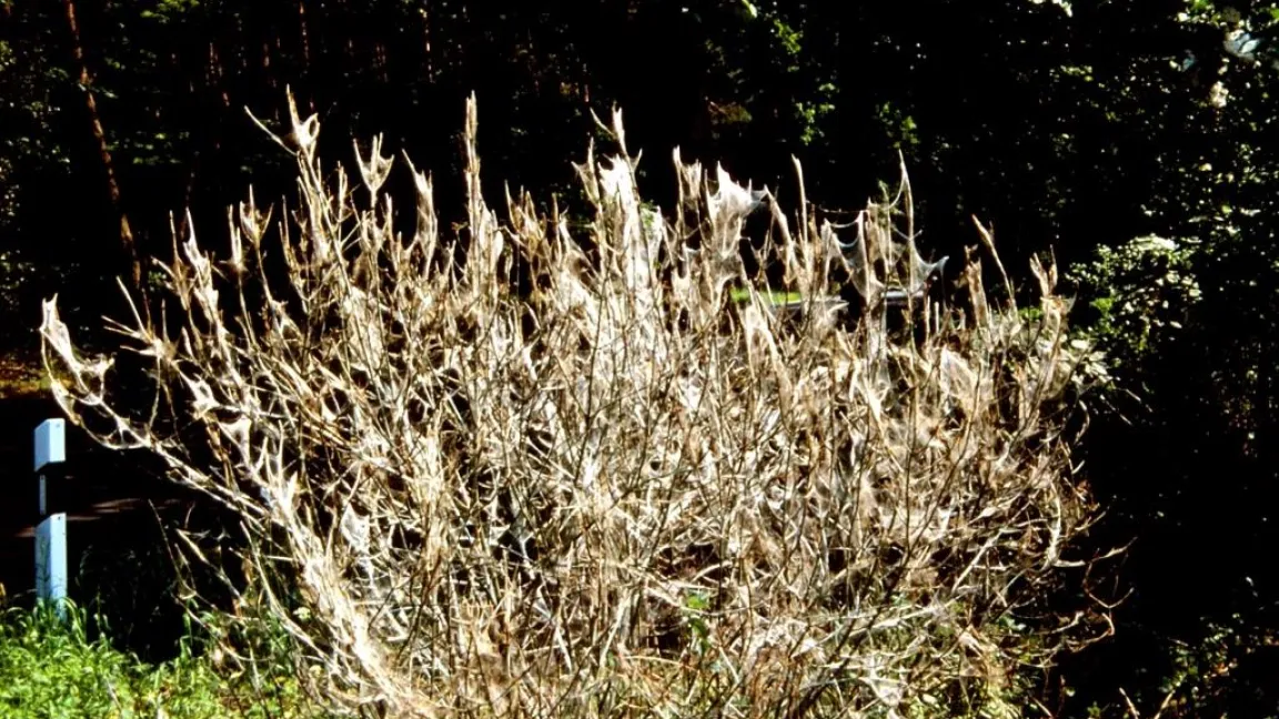 Ab Mai sind am Pfaffenhütchen zunächst kleine, jedoch ständig an Größe zunehmende, weiße, oft schleierartige Gespinste zu finden. Die Sträucher erscheinen dann wie von mehreren Schleiern eingehüllt. Darin werden die Blätter völlig weggefressen, sodass die Sträucher dann kahl werden. Ursache ist die Spindelbaumgespinstmotte – Hyponomeuta cognatellus (H. evonymi). Im Schutz dieser Gespinste fressen die bis zu 2 Zentimeter langen, gelblichen und mit schwarzen Punkten versehenen Raupen. Sie verpuppen sich hier. Ab Juli können kleine weiße Schmetterlinge beobachtet werden, die auf den Vorderflügeln schwarze Punkte tragen. Ihre Flügelspannweite beträgt nur 2 Zentimeter. Sie legen ihre Eier auf den Zweigen ab. Die bald schlüpfenden Jungraupen überwintern dort.