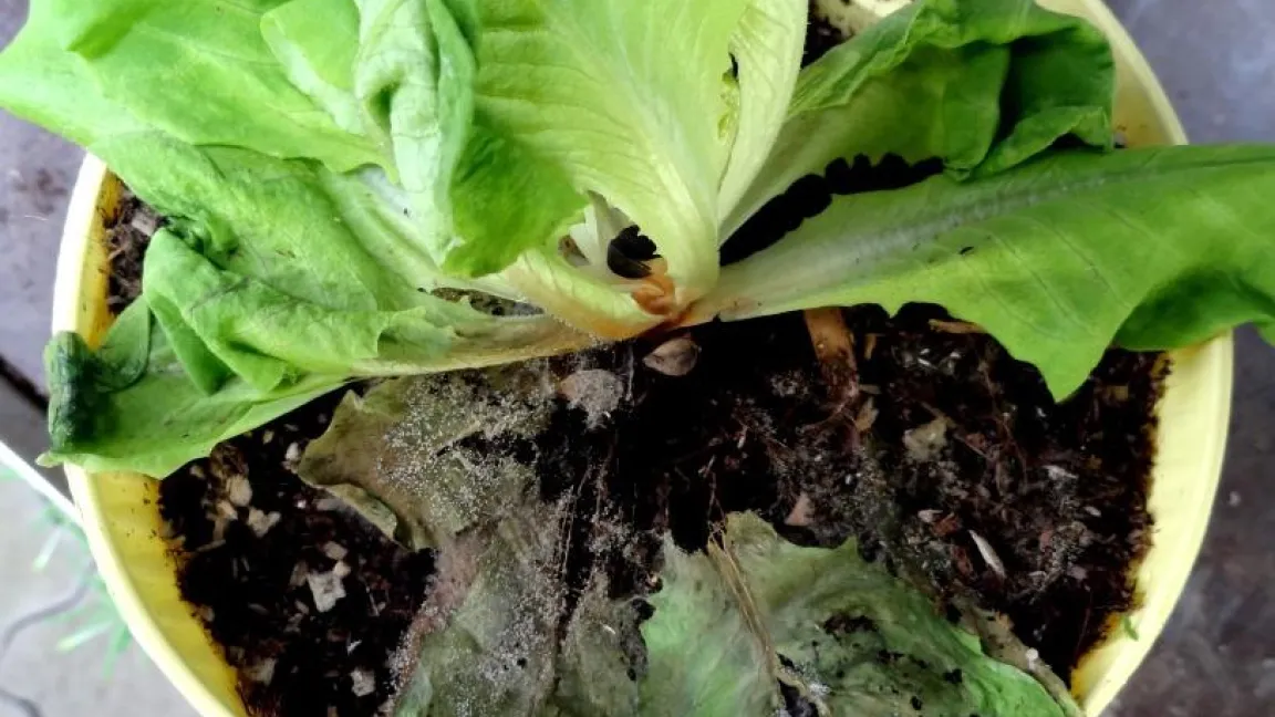Bei Kopfsalat kann es zur Botrytis-Grauschimmelfäule kommen, wenn zu tief gepflanzt wird. An Jungpflanzen werden dann der Stängelgrund und die unteren, meist auf dem Boden aufliegenden Blätter braun und haben den typischen mausgrauen Schimmelrasen. Schließlich können die Blätter völlig welken und absterben. Beim Anbau im Kleingewächshaus sollte vorbeugend ausreichend gelüftet und nicht in den Nachmittags- oder Abendstunden gegossen werden. So können die Blätter trocken in die Nacht gehen und dem Pilz werden die Infektionen erschwert.