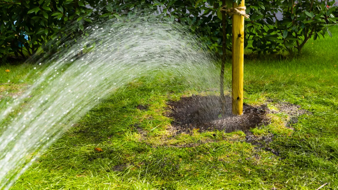 Anfangs sollte der Obstbaum gut gewässert werden. So werden Hohlräume im Boden geschlossen und die Wurzeln bekommen an allen Stellen direkten Kontakt mit der Erde, sodass der Baum gut anwächst. Später ist es vorteilhafter, das Gehölz nur ein- bis zweimal pro Woche kräftig zu gießen, als jeden Tag nur ein bisschen. Denn dadurch bildet der junge Baum schneller Feinwurzeln. Im zweiten und dritten Jahr benötigt der Baum nur noch alle ein bis zwei Wochen eine Bewässerung oder bei Bedarf, wenn es längere Trockenperioden gibt oder Anzeichen von Trockenstress beobachtet werden. Ältere Bäume sind – außer bei extremer Hitze – in der Lage, das benötigte Wasser selbst aus dem Boden zu ziehen.