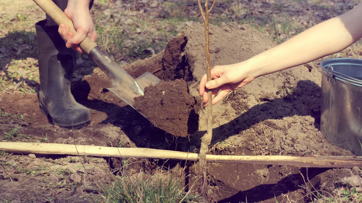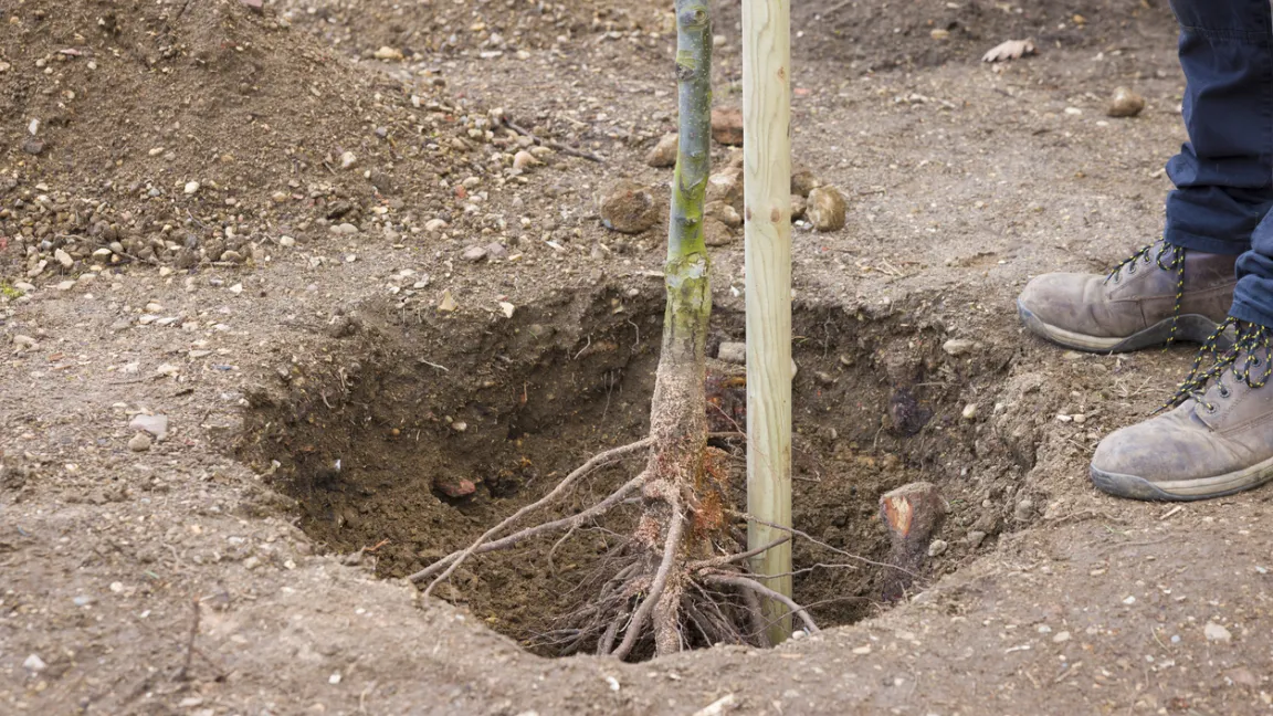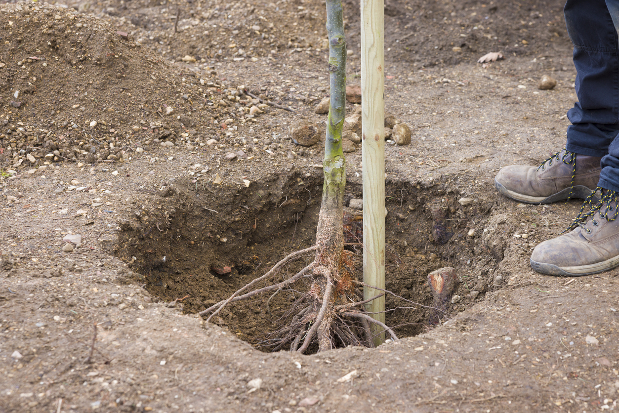 Sitzt der Baum probeweise im Pflanzloch, ist das auch eine gute Gelegenheit, die Position für einen Pfahl zu bestimmen. An diesem wird das Gehölz zum Schutz vor Windschäden später festgebunden. Er sollte 10 bis 15 Zentimeter Abstand zum Baumstamm haben und gen Westen ausgerichtet sein. Zum Einschlagen den Baum sicherheitshalber entfernen, um seine Wurzeln nicht zu beschädigen. Wenn die Sohle des Pflanzlochs anschließend noch mit der Grabegabel etwas aufgelockert wird, ist alles vorbereitet, um den Obstbaum zu pflanzen.