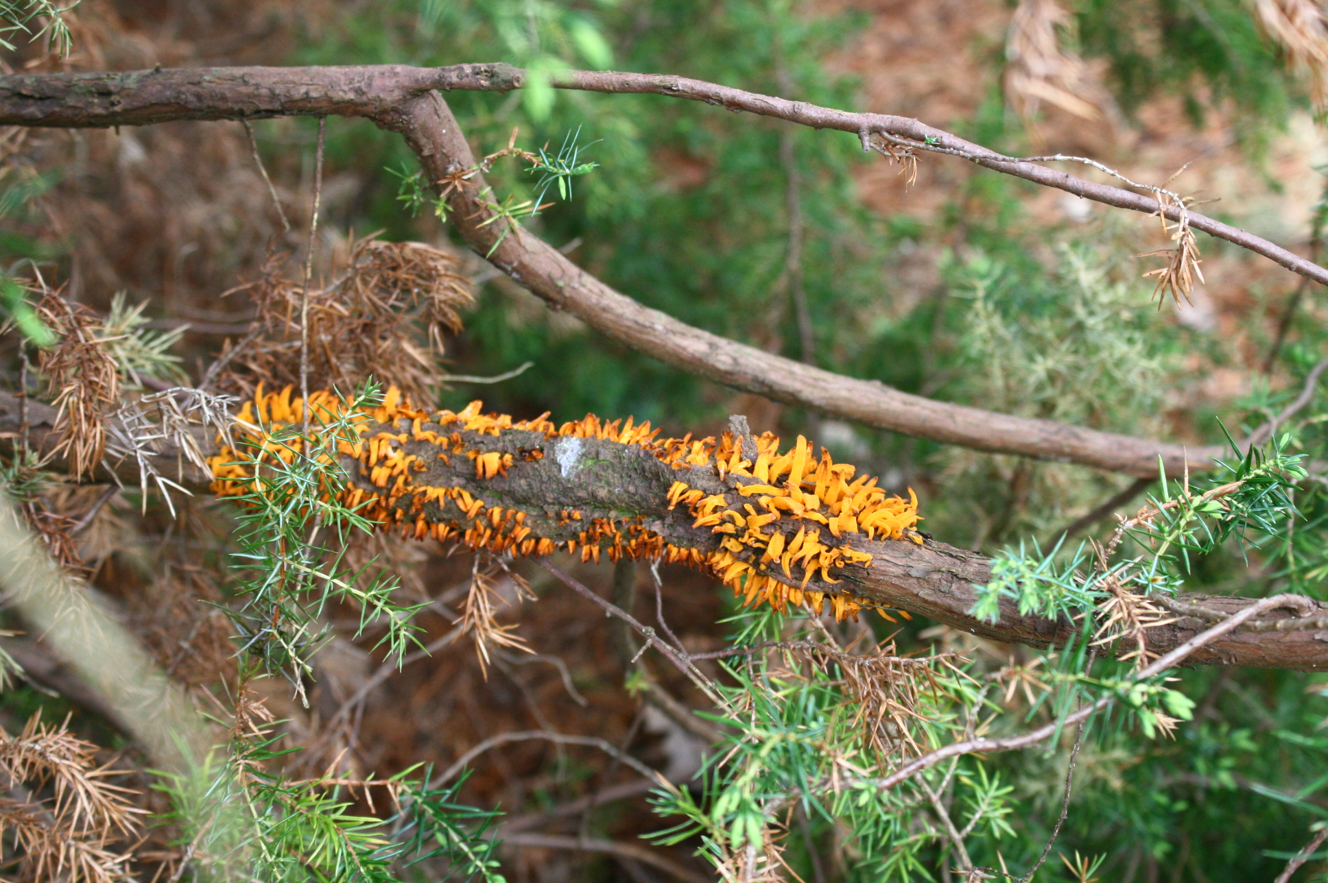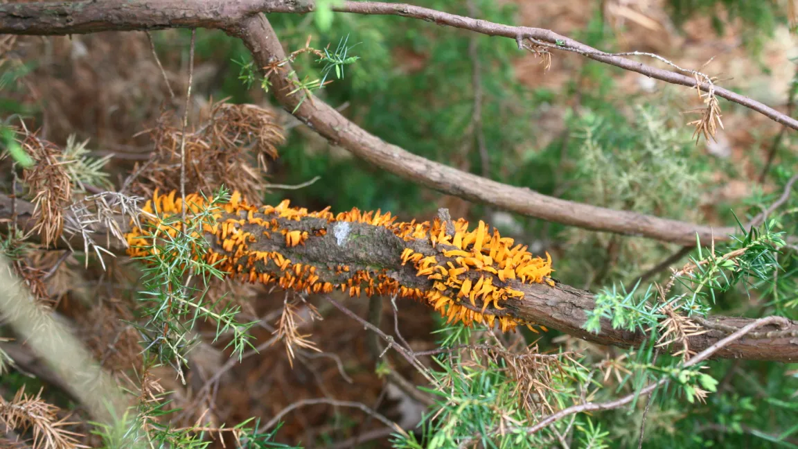 Birnengitterrost wechselt vom Laub der Birnbäume auf die Zweige der Wacholderarten Juniperus virginiana, J. sabina und J. chinensis. Foto: Heinrich Beltz