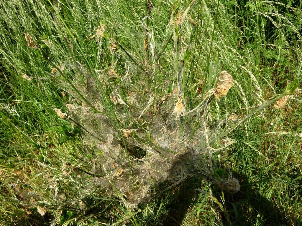 Ab Mai sind am Pfaffenhütchen zunächst kleine, jedoch ständig größer werdende, weiße, oft schleierartige Gespinste zu finden. Die Sträucher erscheinen dann wie von mehreren Schleiern eingehüllt. Darin werden die Blätter völlig weggefressen, sodass die Sträucher dann kahl dastehen.