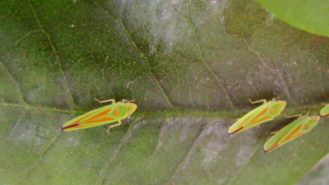 Ab Anfang Mai schlüpfen die gelblichen Junglarven der Rhododendronzikade Graphocephala coccinea aus den Eiern, die in den Knospen überwintern. Sie sind nebst ihren weißlichen Häutungsresten blattunterseits zu finden. Die Larven halten sich, wie auch später die erwachsenen Zikaden vor allem an den Spitzen der Jungtriebe auf und saugen an den Blättern, die dadurch gelblich gesprenkelt aussehen. An den Saugstellen können auch Bakterien eindringen, was zu einer Braunfärbung führt.