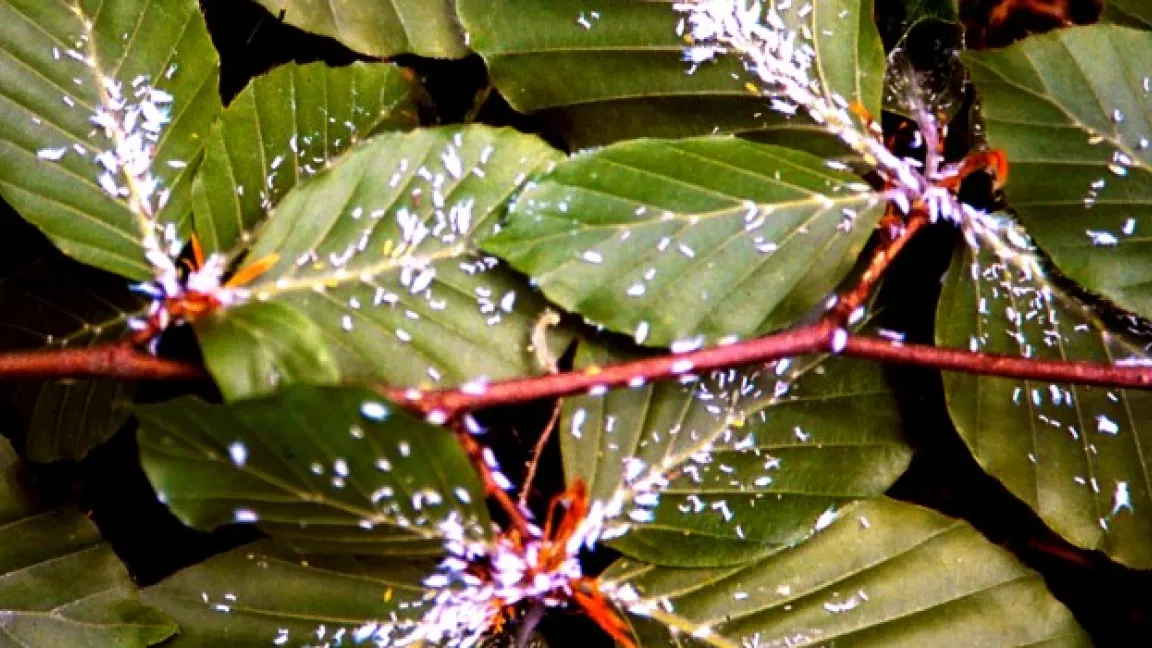 Buchenblattläuse verursachen gewellte Blätter mit nach unten gebogenen Rändern, die gelbscheckig werden und schließlich verbräunen und vertrocknen. Die etwa zwei Millimeter großen Läuse (Phyllaphis fagi) saugen an den Blattunterseiten. Sie sind an ihren bläulich-weißen wolligen Wachsausscheidungen gut zu erkennen. Ihre Saugtätigkeit lässt eine starke Verschmutzung mit Honigtau entstehen und verursacht insbesondere an Jungpflanzen erhebliche Schäden. Vom Frühjahr bis Frühsommer bringen die Buchenblattläuse mehrere Generationen hervor. Die Eier überwintern an den Knospen.