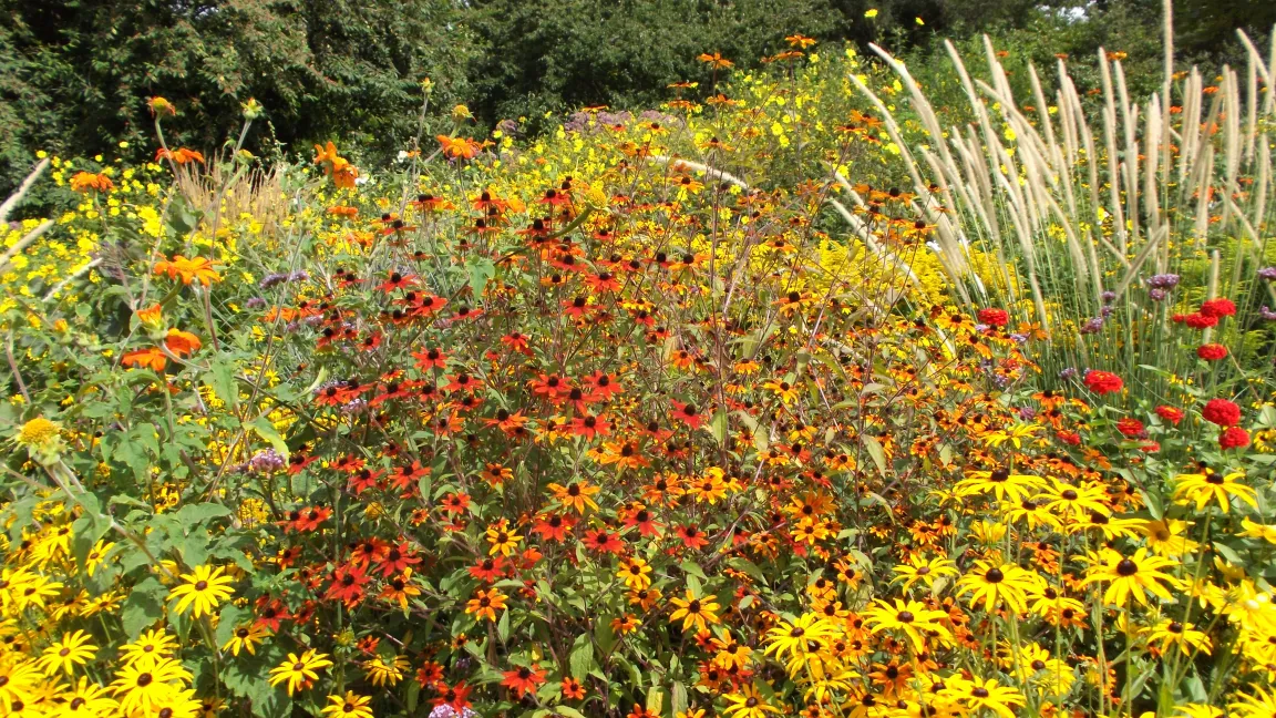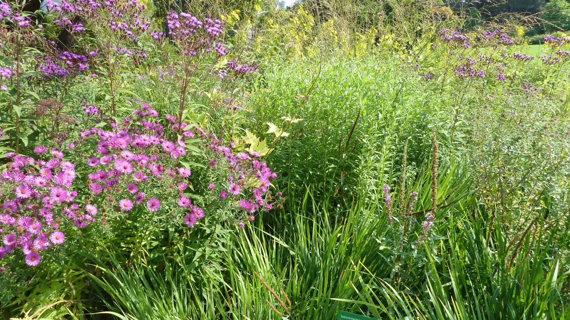 Beim Rundgang Mitte August stehen die meisten Stauden in voller Blüte – ein Farbenmeer in Gelb und Orange. Im inneren Bereich prangen die Wildstauden. Auf der Feuchtwiese wachsen Gräser und dekorative Schilfkolben. Die Gehölzränder sind europäischer und asiatischer Herkunft, und besonders farbenprächtig sind der Präriegarten und die nordamerikanischen Beetstauden vor dem Gärtnerhaus. Hier finden sich Hochsommerblüher wie Distel, mediterrane Artischocke und Kugeldistel.