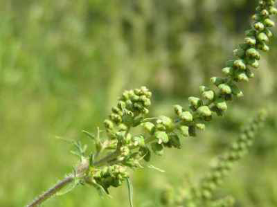 Die kleinen, unscheinbaren gelben Blütenköpfchen in den fingerförmigen, grüngelblichen Blütenständen des Traubenkrauts Ambrosia artemisiifolia tragen je Pflanze bis zu einer Milliarde Pollen. Sie können allergische Reaktionen der Augen und Atemwege auslösen und zu Asthma führen. Da Ambrosia erst im August und September blüht, verlängert sich durch sie noch die Pollensaison.