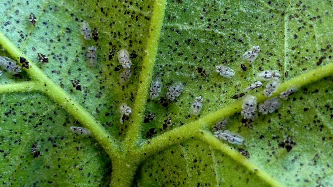 Auf der Blattoberseite zeigen sich zahlreiche kleine, helle Pünktchen, zunächst vorzugsweise entlang der Blattadern. Später sind sie über die ganze Blattspreite verteilt. Die Symptome ähneln denen von Zikaden. Sie sind aber damit nicht zu verwechseln, weil bei einem Netzwanzenbefall auf der Blattunterseite in großen Mengen schwarze Kot-Tröpfchen zu finden sind. Bei starkem Befall bekommen die Blätter ein vergilbtes, blasses Aussehen und können sich schließlich braun färben, absterben und abfallen. Auf den Blattunterseiten sind die drei bis vier Millimeter großen Wanzen Corythuca ciliata zu finden. Sie haben durch ihre hellen, netzartigen, den Körper überragenden Deckflügel sowie Seitenlappen ein charakteristisches Aussehen.