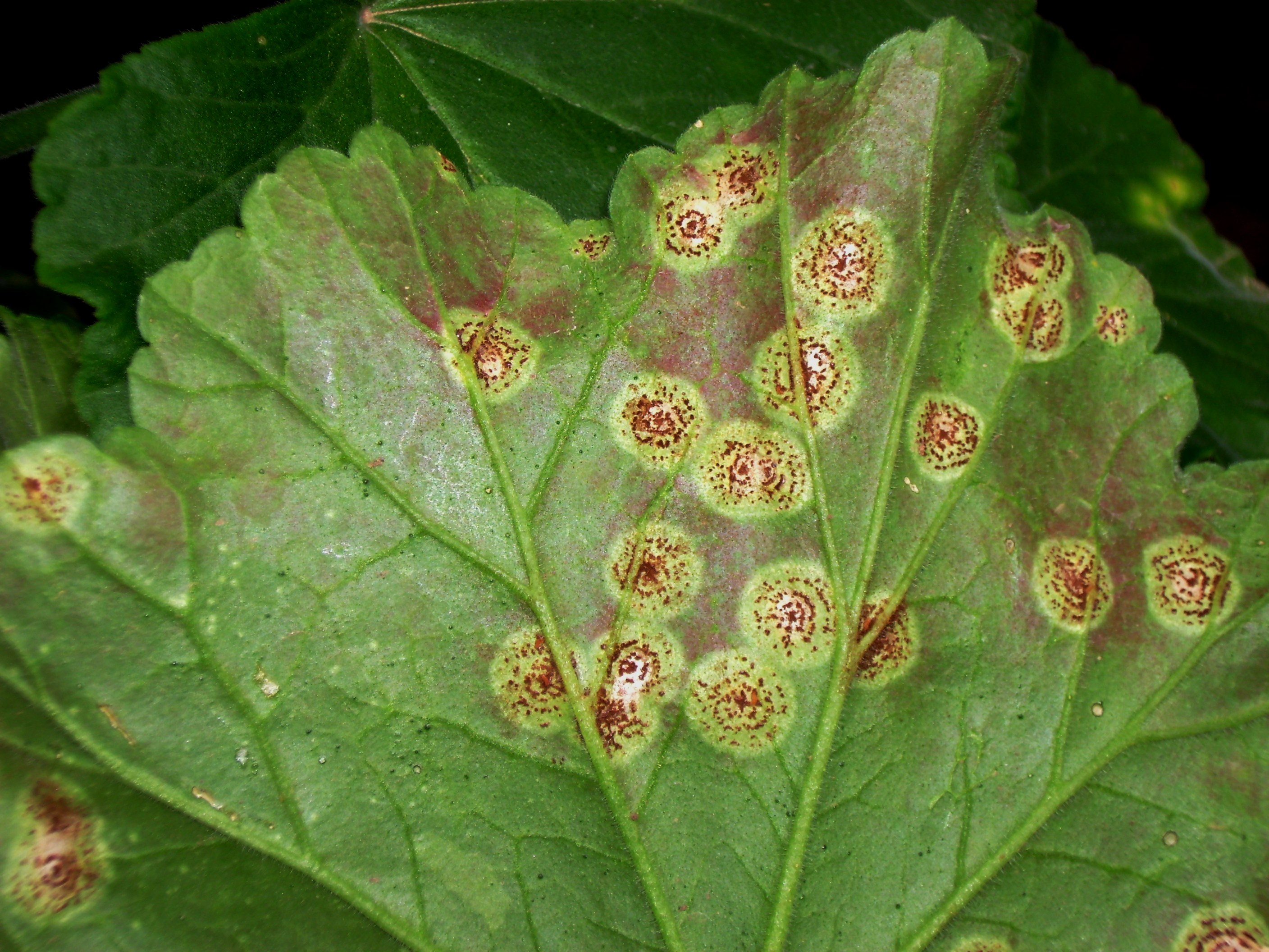 Diese Krankheit befällt ausschließlich Zonal-Pelargonien. Die Efeupelargonie und Edelpelargonie (Englische Pelargonie) werden von diesem Rost-Erreger nicht befallen. Auf der Blattoberseite erscheinen zahlreiche bleiche, blassgelbe Flecken von 0,5 mm Größe, die leicht übersehen werden. Sie verfärben sich bald gelb und erreichen eine Größe von 6 bis 8 Millimetern. An diesen Stellen brechen im weiteren Krankheitsverlauf auf der Blattunterseite braune, stäubende Sporenlager hervor, die in konzentrischen Ringen erscheinen. Die optimalen Infektionstemperaturen für den Pilz liegen zwischen 11 und 17 °C. Hohe Temperaturen werden von ihm weniger gut vertragen. Temperaturen über 30 °C verzögern sogar das Keimen der Sporen. Bei starkem Befall fließen die Flecke ineinander, und das führt schließlich zum Vergilben, Vertrocknen und Abfallen der Blätter. Die Infektionen können auch am Stängel beobachtet werden. Starker Befall führt nicht selten zum Absterben der ganzen Pflanze, insbesondere wenn schon Stecklinge oder Jungpflanzen infiziert werden. Auch während des Überwinterns der Pflanzen muss mit einer Ausbreitung des Befalls gerechnet werden. Bei beginnendem Auftreten lohnt es sich, konsequent alle Blätter rechtzeitig bei Sichtbarwerden der ersten Aufhellungen blattoberseits abzupflücken und zu vernichten. Bei weiter sich ausdehnendem Befall wird der Einsatz eines der zahlreichen gegen Rostpilze an Zierpflanzen zugelassenen Präparate unumgänglich.