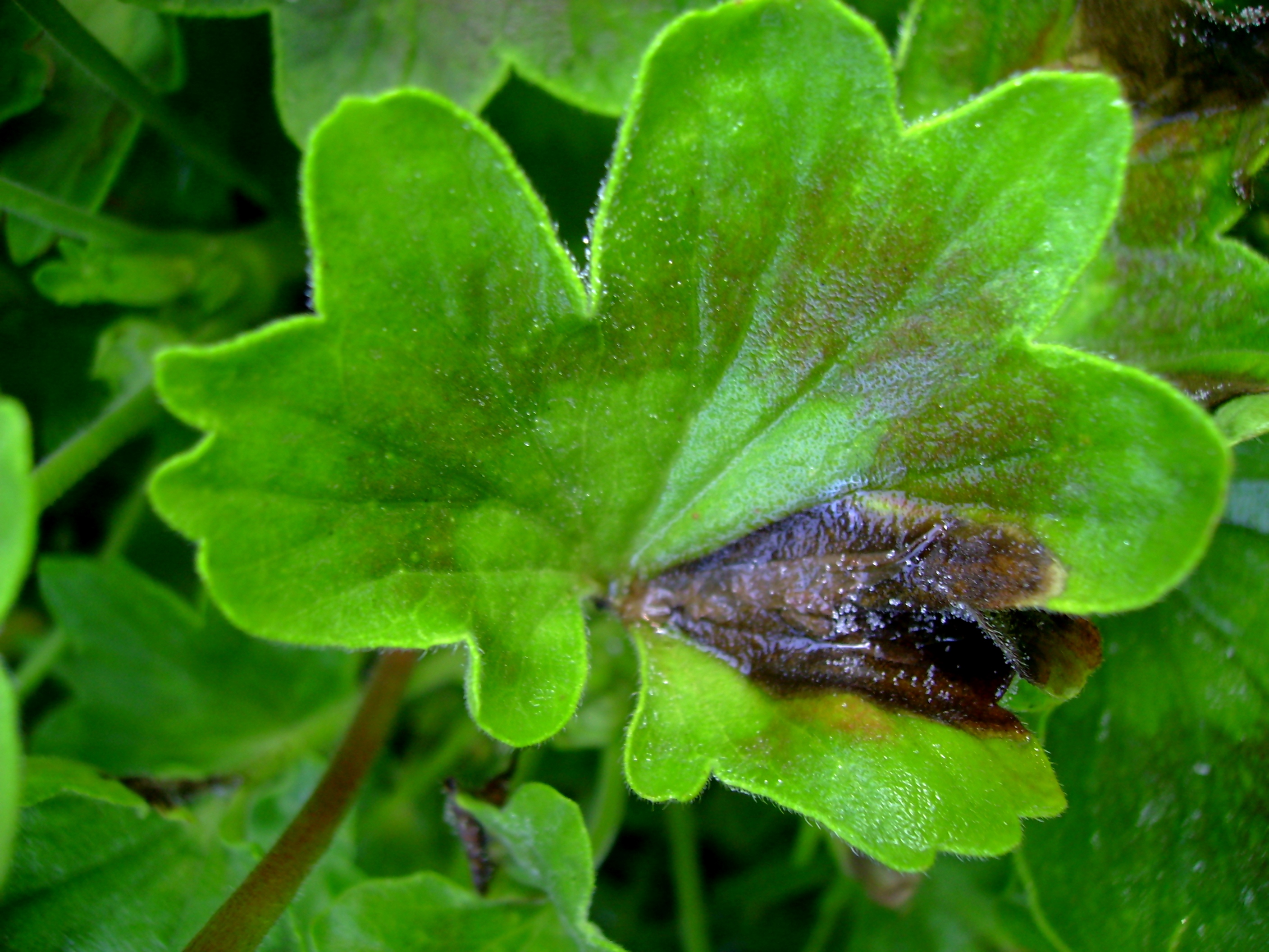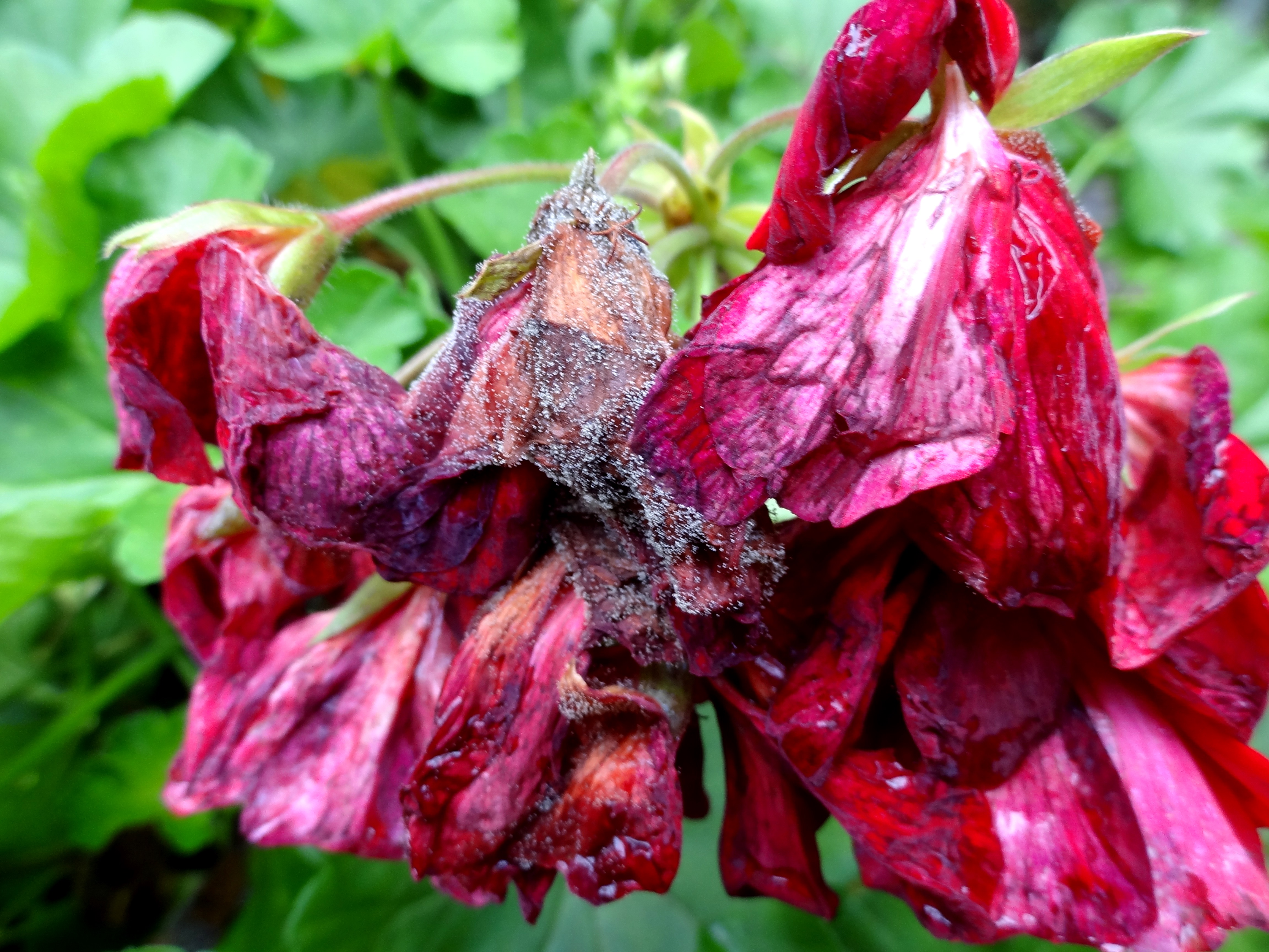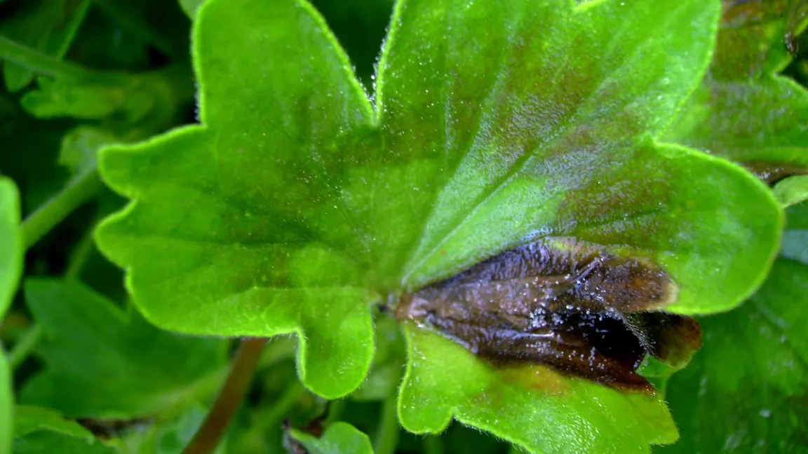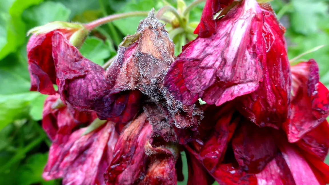 Bei trüber, feuchtkühler Witterung und insbesondere in engen Pflanzenbeständen, die zudem noch eine Stickstoff-betonte Düngung erhalten haben, sind häufig an verschiedenen Pflanzenteilen fahlgrüne bis graubraune, gelegentlich glasig-feuchte Faulstellen mit einem grauen stäubenden Pilzbelag zu beobachten. Es handelt sich dann um die durch den pilzlichen Erreger Botrytis cinerea verursachte Grauschimmelfäule. Der Erreger ist weit verbreitet und kann bei einer Vielzahl an Pflanzenarten auftreten. In der Literatur werden mehr als 255 Wirtspflanzenarten angegeben. Bei Pelargonien breiten sich die graubraunen Faulstellen beginnend am Rande der Blätter schnell aus und gehen auch auf Stängel und Blüten über, die dann absterben. Besonders gefährdet sind Pflanzen, die durch ungünstige Witterungs- oder Kulturbedingungen geschwächt sind. Deshalb wird der Grauschimmel auch als Schwächeparasit bezeichnet. Der Erreger siedelt sich meist zuerst auf absterbenden und abgestorbenen Pflanzenteilen an und geht dann auf benachbartes noch lebendes Pflanzengewebe über. Der graubraune Schimmelrasen besteht aus Konidienträgern, die zahlreiche Konidien in die Luft entlassen. Sie werden durch die Luftbewegung, mit Wasserspritzern oder bei Kulturarbeiten verbreitet. Der Pilz kann die Pflanzen infizieren, wenn für die Sporen Wasser in Form von Regen-, Tau- oder Gießwassertropfen vorhanden ist. Es wird angegeben, dass der Pilz in einem Temperaturbereich von fünf bis 35 °C wächst, wobei sogar Wachstum an der Null-Grad-Grenze beobachtet wurde. Auf einen Grauschimmelbefall ist vor allem während des Überwinterns zu achten. Hier bestehen in den geschlossenen Räumen oft günstige Infektionsbedingungen. Deshalb muss durch regelmäßiges Lüften und Ausputzen der Pflanzen dafür gesorgt werden, dass keine abgestorbenen Pflanzenteile und hohe Luftfeuchte bei niedrigen Temperaturen sowie geringe Luftbewegung den pilzlichen Erreger begünstigen. Wenn diese Maßnahmen nicht ausreichen,kann auch ein Einsatz von zugelassenen Fungiziden nötig werden.