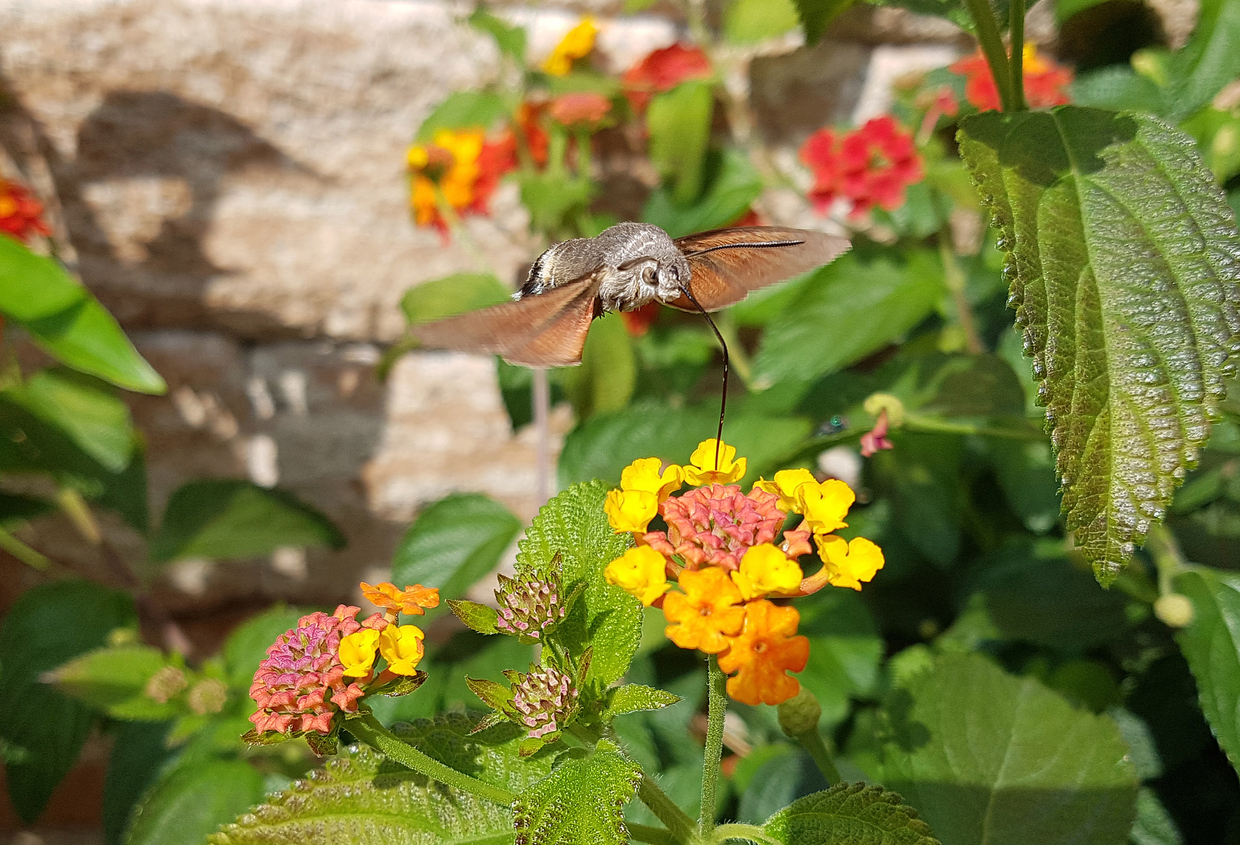 Wandelröschen sind nicht nur schön anzuschauen, sondern ihre kleinen bunten Blüten locken auch eine Vielzahl von Insekten an. In der Heimat der Pflanze gehören Kolibris zu den häufigsten Bestäubern. Diese sind zwar in Deutschland nicht anzutreffen, dafür aber ein Insekt, das den kleinen Vögeln sehr ähnlich sieht: das Taubenschwänzchen. Dieser Wanderfalter kam ursprünglich nur am Mittelmeer vor, verbreitet sich aber zunehmend auch in Deutschland. Wie ein Kolibri schwirrt er von Blüte zu Blüte und taucht seinen langen Rüssel in die Blüten, um an den Nektar zu kommen. Auch Bienen und Schmetterlinge schätzen das Wandelröschen als ergiebige Futterquelle.