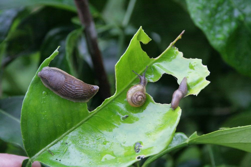 Auch Schnecken machen sich am jungen Gewebe von Zitruspflanzen häufig zu schaffen. Daher sollten die Pflanzen möglichst trocken gehalten und die Schnecken abgesammelt werden. Oft sitzen sie unter den Töpfen.
