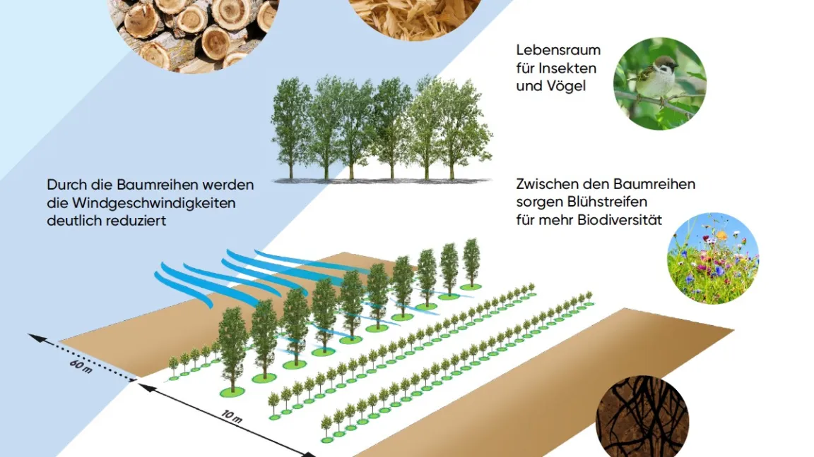 Von der Kombination des Ackerbaus mit Anbau und Nutzung von Bäumen versprechen sich Experten Vorteile für die Artenvielfalt auf dem Feld und die Erträge der Kulturen und nicht zuletzt eine deutliche Erosionsminderung durch Starkniederschläge oder Wind.