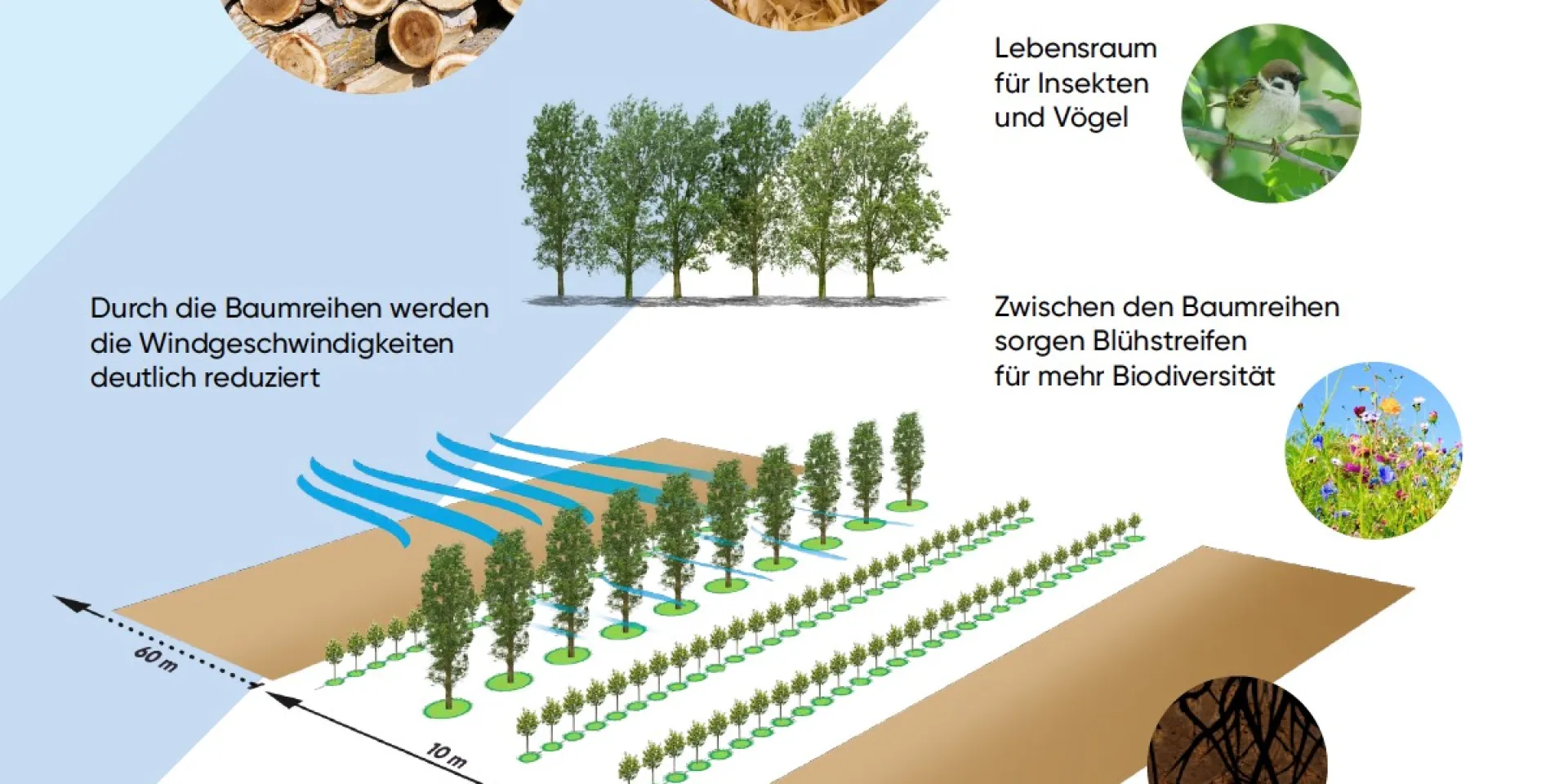 – Verbesserte Wasserversorgung: Bäume reduzieren die Windgeschwindigkeit, das Mikroklima verbessert sich und die Verdunstung in der Ackerkultur wird verringert.