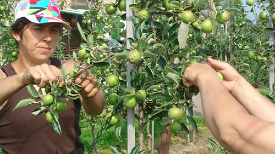 Das Ausdünnen ist eine Kunst für sich: Manchmal lässt man nur einen Apfel pro Trieb hängen, manchmal zwei, drei oder vier. Wichtig ist, dass die Früchte unverletzt und gut genährt sind, denn dann werden sie sich weiterhin prächtig entwickeln.