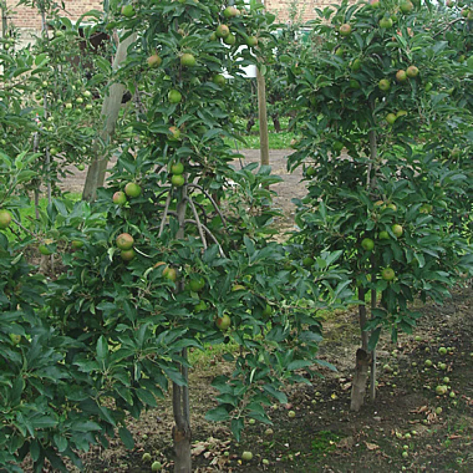 Aber auch der Stiel spielt eine Rolle: Weil an unseren Apfeltrieben immer fünf Blüten eng zusammenstehen, haben bei Sorten mit kurzen Stielen maximal zwei Äpfel genug Platz, wie zum Beispiel beim Berlepsch. Seine Stiele sind so dick und fest, dass sie bei der Lagerung sogar andere Äpfel verletzen können. Bei Jonagold und Pinova sind sie dagegen lang und geschmeidig. Und meine liegen dazwischen.