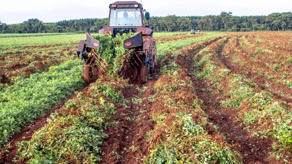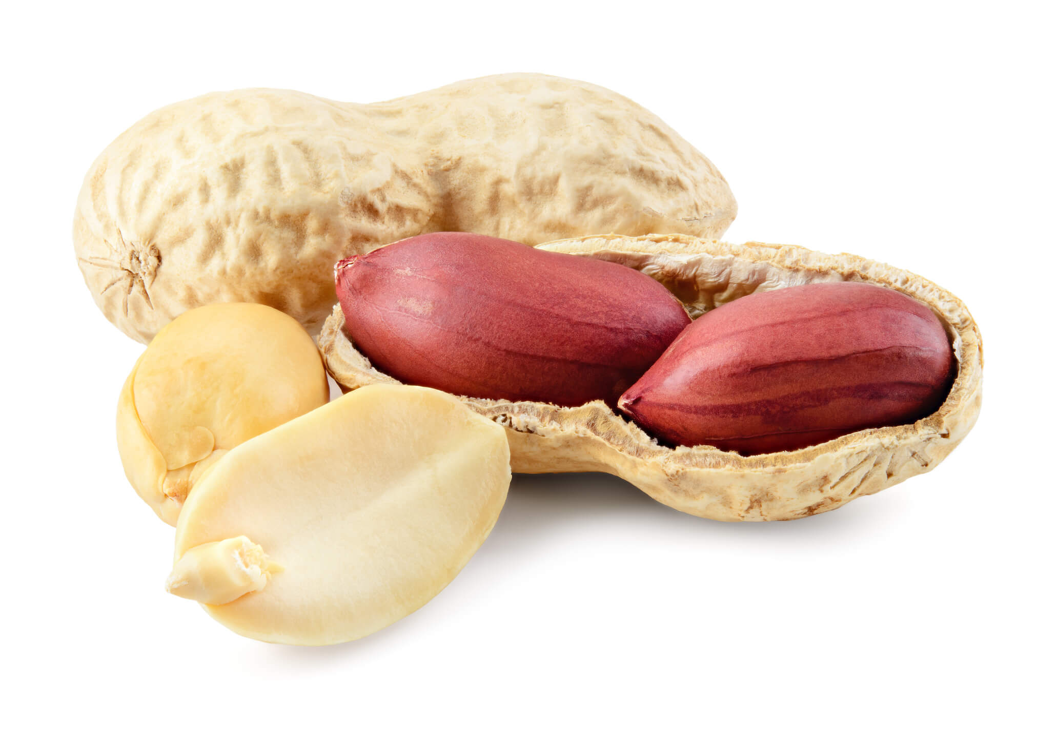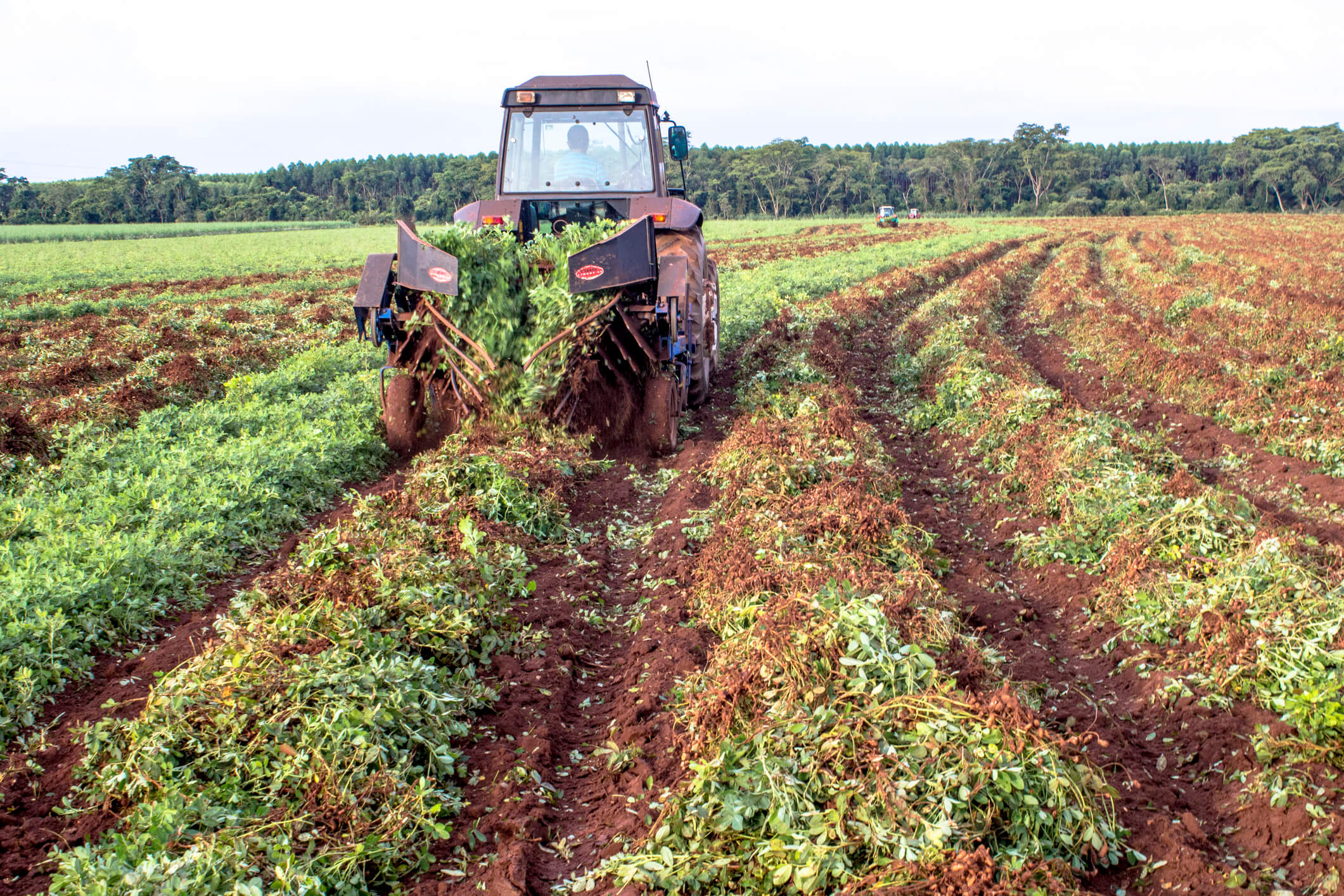 Der richtige Erntezeitpunkt ist gekommen, wenn sich die Blätter gelblich verfärben. Das geschieht ungefähr 130 Tage nach der Saat. Dann werden die Triebe mit den Hülsen maschinell aus dem Boden gezogen und zum Trocknen auf dem Feld abgelegt. Der Wassergehalt liegt zunächst bei 40 Prozent, das Ziel sind 5 bis 10 Prozent. Nach dem Dreschen aus den Hülsen und dem Entschalen werden die Nüsse weiterverarbeitet.