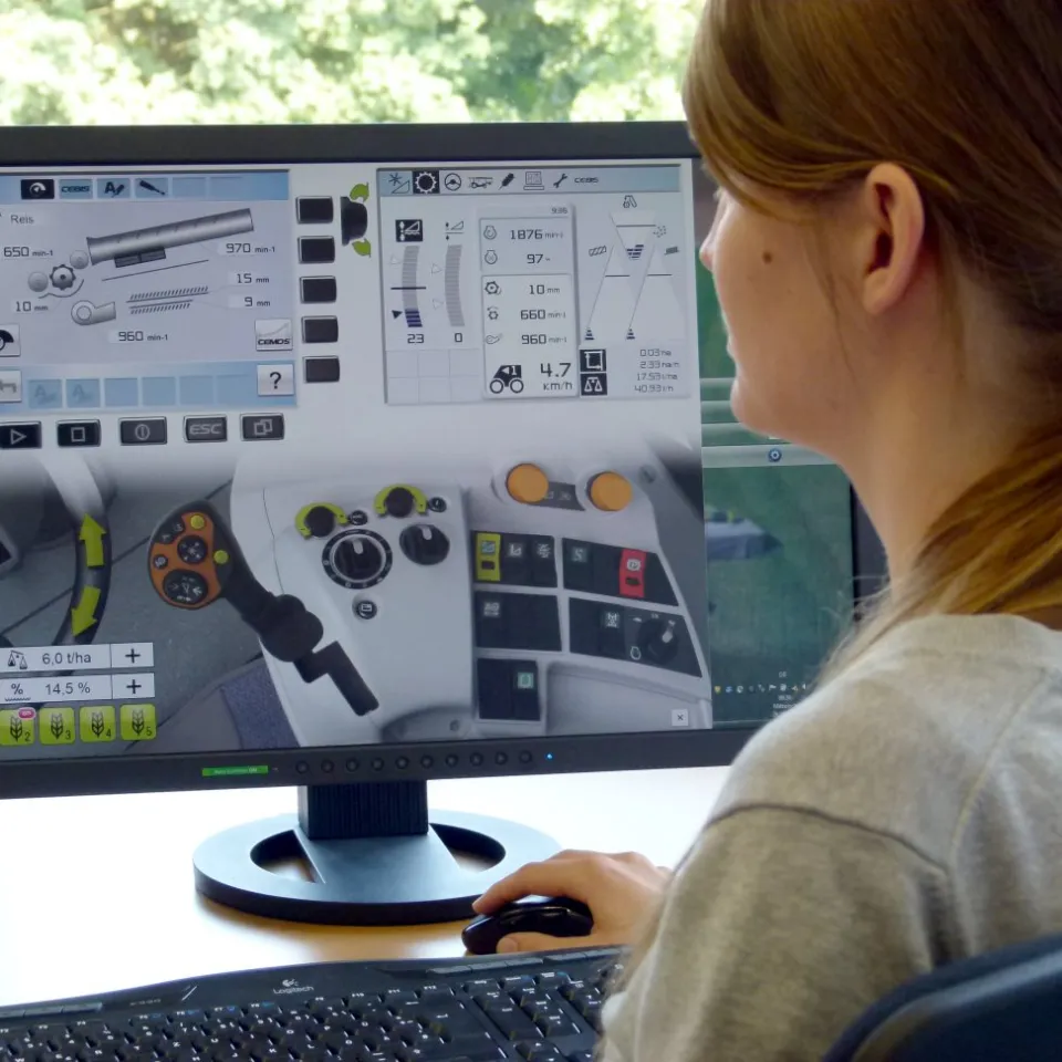 Es handelt sich um ein Programm zur Bedienung eines virtuellen Claas Lexion-Mähdreschers. Der Nutzer kann online vom PC aus trainieren und das zu jeder Zeit und von jedem Ort aus. Alle Bedienelemente werden originalgetreu auf dem Bildschirm abgebildet und mit der PC-Maus gesteuert. Hierzu nutzt der Simulator die Original-Software und Daten, die während der Ernte verschiedener Kulturen bei unterschiedlichen Bedingungen ermittelt worden sind. Was passiert, wenn der Mähdrescher zu schnell gefahren wird oder die Maschineneinstellungen bei einem Wechsel von einem Gersten- zu einem erntereifen Weizenacker beibehalten werden? Das sind zwei typische Awendungsbeispiele.
