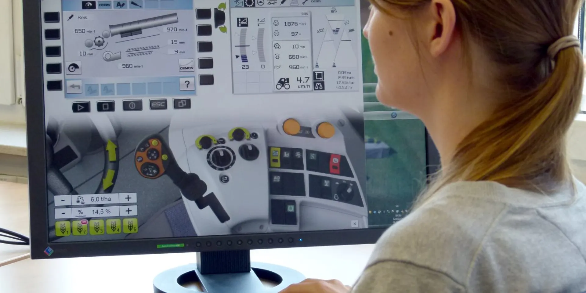Alle Bedienelemente eines Mähdreschers werden originalgetreu auf dem Bildschirm abgebildet und mit der PC-Maus gesteuert. Foto: Claas