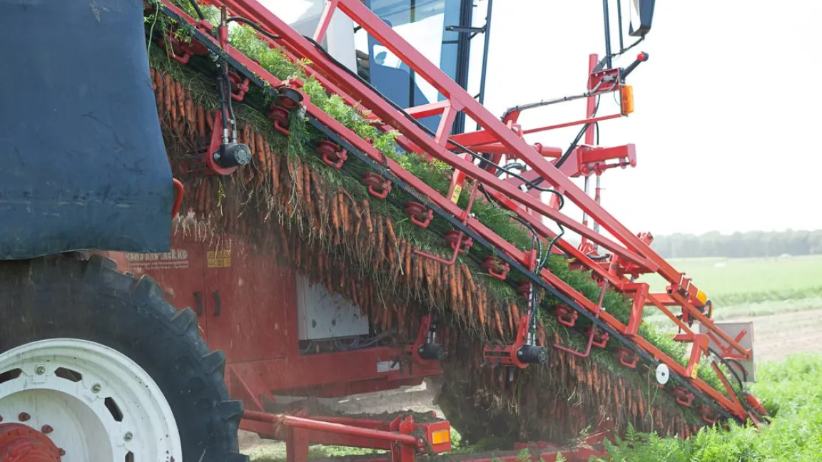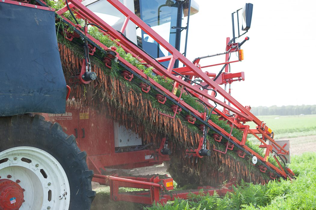 Weit verbreitet sind Klemmbandroder, die die Möhren am Kraut aus dem Boden herausziehen. Je nach späterer Verwendung wird das Kraut bereits auf dem Acker von den Wurzeln entfernt. Im Herbst geerntete Lagermöhren werden mit der anhaftenden und frischhaltenden Erde in Kisten gefüllt. Diese Kisten kommen ins Kühllager, das einen „Winterschlaf“ von November bis in den April ermöglicht. Weil die neue Ernte ab Mitte Mai startet, können deutsche Anbauer den Markt nahezu ganzjährig mit eigener Ware versorgen. Man sollte das Gemüse nicht zusammen mit Äpfeln, Tomaten und anderen Nahrungsmitteln, die Ethylen abgeben, lagern. Das Gas beschleunigt die Alterung. Im Gemüsefach des Kühlschranks bleiben Möhren lange knackig-frisch. In Folie eingepackt verlieren sie kaum Wasser.