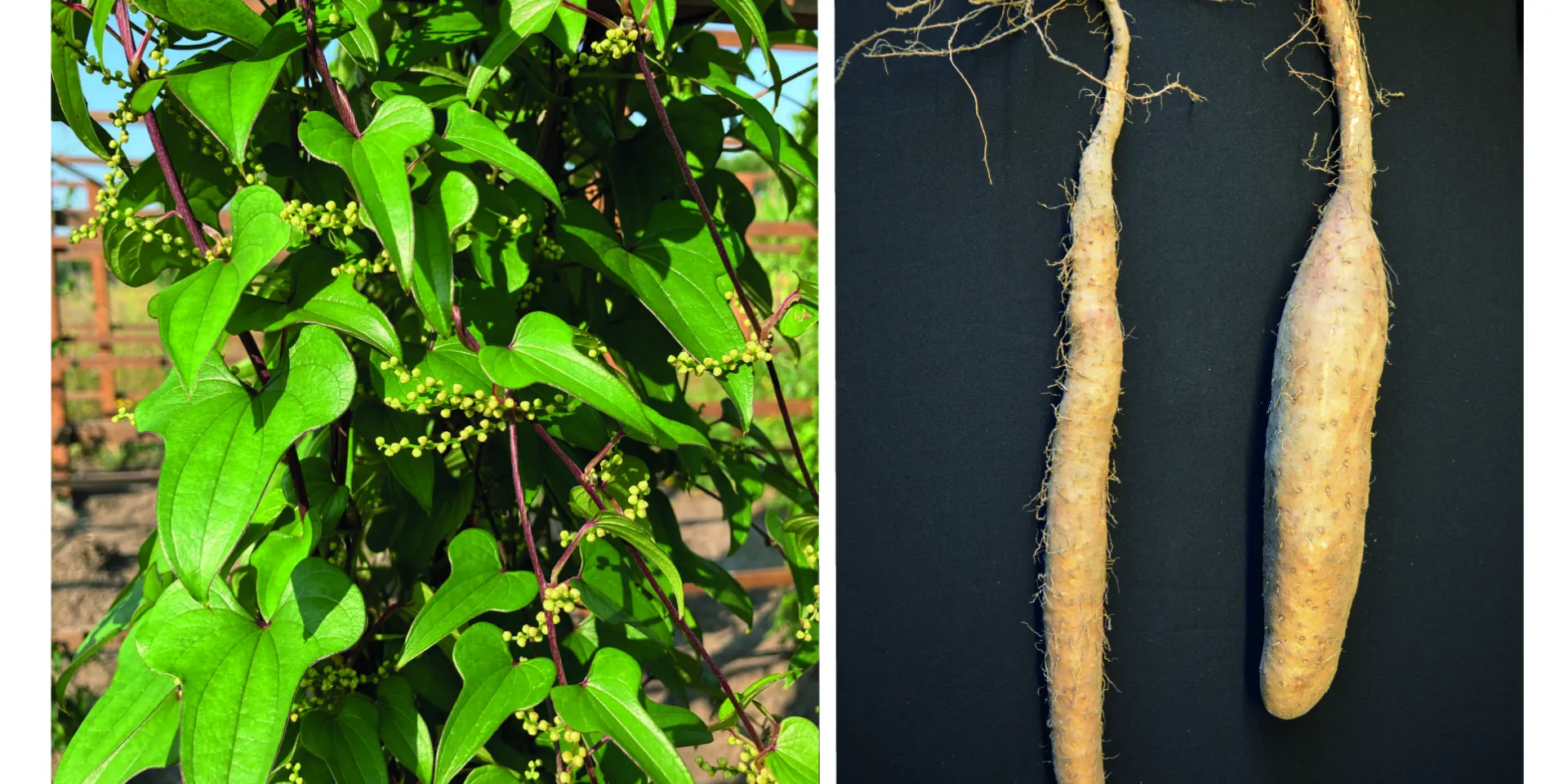 Links: Blätter und Blüten der Chinesischen Yams. Rechts: Die Knollen der Chinesischen Yams werden ungefähr einen halben Meter lang und mehrere Kilogramm schwer. Sie enthalten viel Stärke, ihr leicht süßlicher Geschmack erinnert an Esskastanien oder Süßkartoffeln. Foto: Dr. Janina Epping/Universität Münster