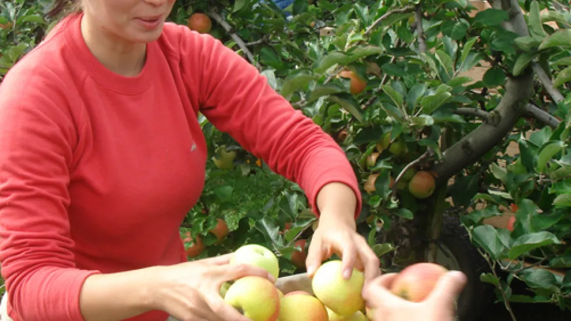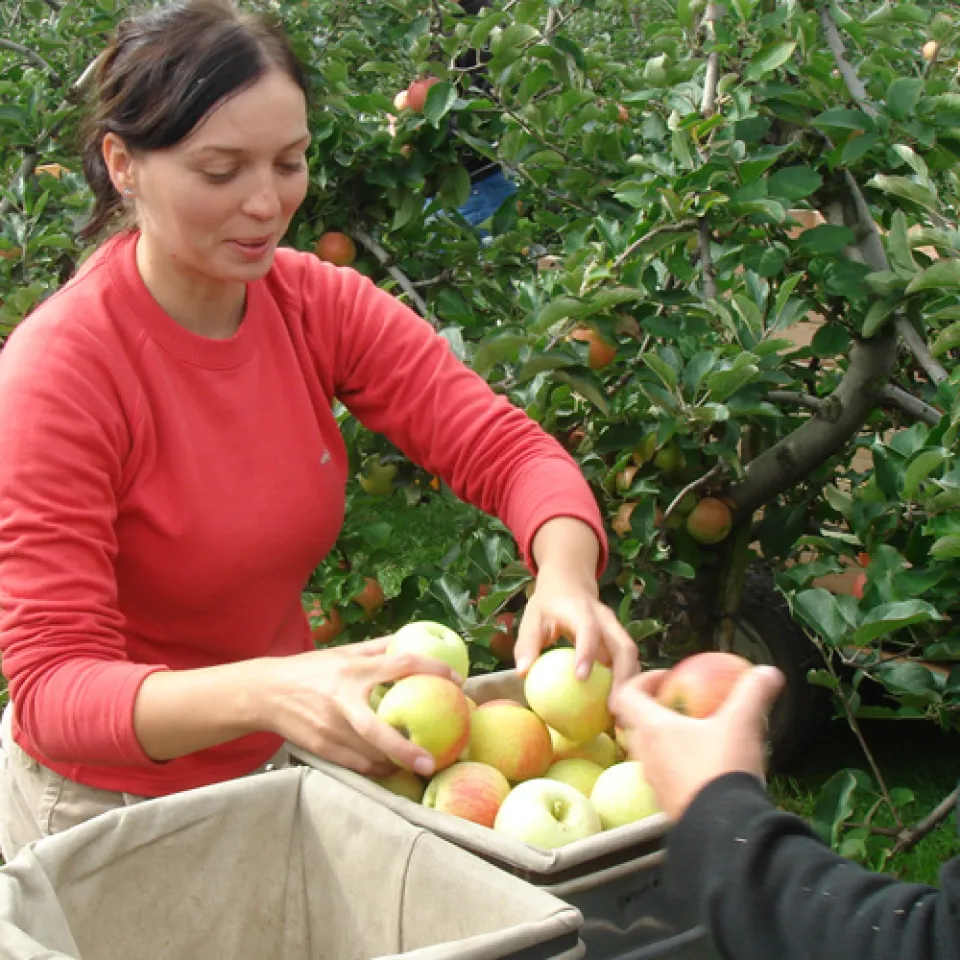 „Erkennt ihr mich auch ohne meine Äpfel wieder? Anfang des Monats wurde die letzte meiner schönen Früchte gepflückt. Sie waren mein ganzer Stolz, aber auch eine ziemlich schwere Last. Knapp 15 Kilo hatte ich die letzten Wochen zu tragen!Um uns Elstar-Bäume herum wird noch fleißig gepflückt: Bei den Spätsorten, den so genannten Winteräpfeln, geht die Ernte bis in den Oktober hinein. Das sind zum Beispiel Golden Delicious, Pinova, Fuji und Braeburn oder auch Boskoop, der beliebte Back- und Kompottapfel. Die Pflücker behandeln unsere Äpfel wie rohe Eier: Vorsichtig werden sie in Eimer gelegt, die mit Tuch ausgeschlagen sind. Dann werden sie ebenso sorgsam in große Holzkisten ausgeleert, damit sie ja keine Druckstellen bekommen oder die Schale verletzt wird. In diesen Kisten werden die Äpfel transportiert und gelagert.