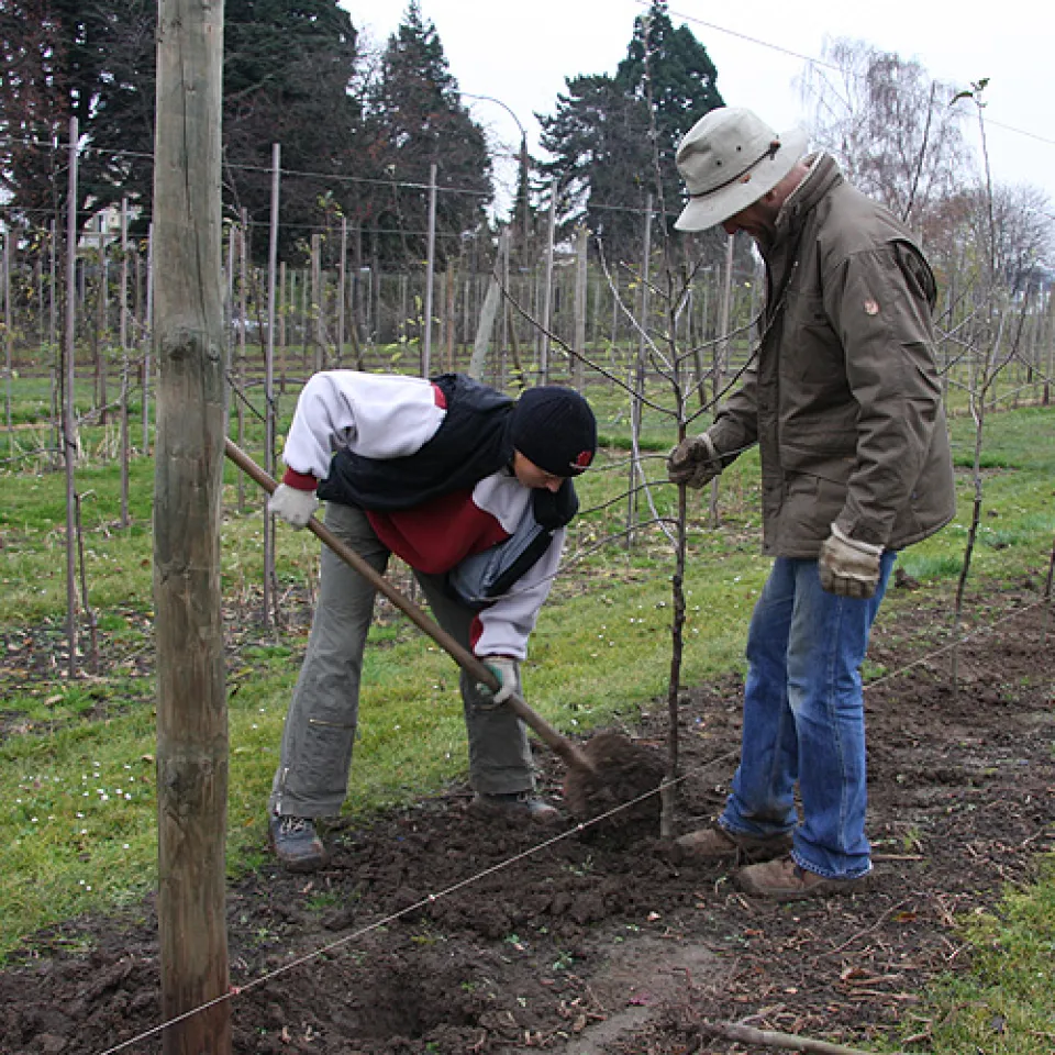 Nach der Ernte ist vor der Ernte: Im November werden alte Apfelbäume gerodet und neue gepflanzt. Dafür errichtet der Obstanbauer neue Gerüste aus Pfählen und Draht, die den Apfelbäumen Halt geben. Auch Hagelnetze können daran befestigt werden. Die Apfelbäume haben eine natürliche Wachstumsbremse: Auf den Wurzeln einer schwachwüchsigen Sorte ist eine Edelsorte aufgesetzt. Die zarten Wurzeln sind eine Delikatesse für Feld- und Wühlmäuse, die sich dank milder Winter stark vermehrt haben. Seinen Bäumen zuliebe muss der Apfelbauer diese im Spätherbst und Winter bekämpfen.6000 neue Apfelbäume