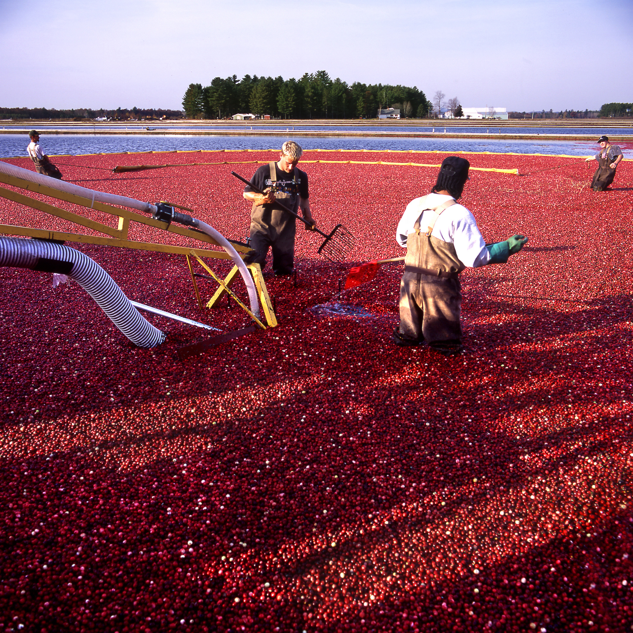 Die Heimat der Cranberries liegt in den Hochmooren Nordamerikas. Dort herrschen ideale Voraussetzungen für den modernen Anbau der Beeren auf großen Flächen. Die Farmer ernten den größten Teil der Beeren, etwa 95 Prozent, durch ein spezielles Verfahren, die sogenannte „Nass-Ernte“: Das heißt, sie fluten ihre Felder mit Wasser und lösen die Beeren durch künstlich erzeugte Wasserstrudel von den Sträuchern. Dank ihrer Luftkammern, schwimmen die Beeren an der Wasseroberfläche. Von dort werden sie in Behälter abgesaugt, über Fließbänder auf Lkws verladen und zur Weiterverarbeitung transportiert. Die übrigen fünf Prozent der Cranberries pflücken die Farmer mit kleinen Erntemaschinen direkt von den Zweigen – dieses Verfahren nennt man „Trocken-Ernte“.