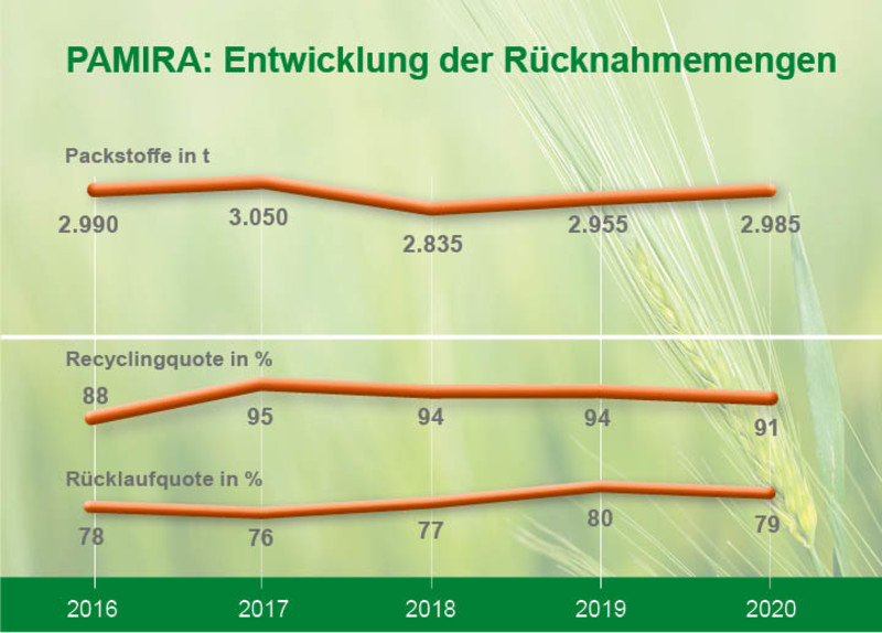PAMIRA hat eine große Akzeptanz in Landwirtschaft und Gartenbau. Obwohl es ohne Pfand arbeitet, liegen die Rücklaufquoten in den letzten Jahren bei etwa 80 Prozent der in Verkehr gebrachten Packstoffe. Die im Industrieverband Agrar e. V. (IVA) organisierten Herstellerfirmen und die mit der Durchführung beauftragte Firma RIGK GmbH wollen die hohe Quote möglichst weiter steigern. So unter anderem durch eine optimierte Zahl und räumliche Verteilung der Sammelstellen und eine zielgerichtete Öffentlichkeitsarbeit über verschiedene Medien und Apps. Dazu beitragen soll auch ein neuerdings digitalisierter Annahmeprozess, der die erforderlichen Formalitäten für Landwirte, Gärtner und Personal an den Sammelstellen beschleunigt und komfortabler macht.