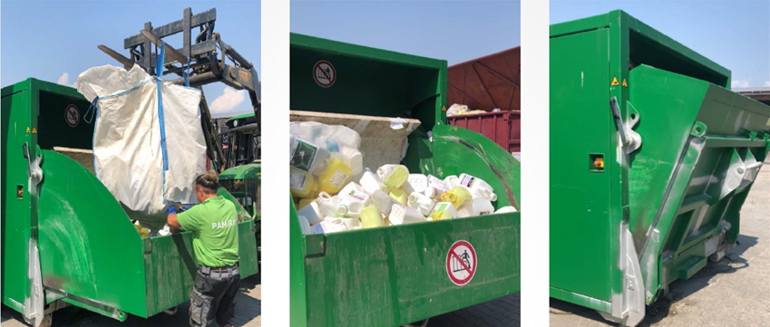 Um den Carbon Footprint noch weiter zu reduzieren, sind 2021 erstmalig drei Presscontainer an den Sammelstellen im Einsatz. Ähnlich wie bei einem Müllwagen werden die leeren Verpackungen am hinteren Ende des geschlossenen Containers in eine Klappe geworfen und anschließend gepresst. Dadurch kann ein Container etwa 4 Tonnen Verpackungen aufnehmen – ohne Verdichtung ist es lediglich 1 Tonne. Die Zahl der Transportfahrten zu den Recyclingstandorten, der Dieselverbrauch und damit die CO2 Emissionen reduzieren sich entsprechend.