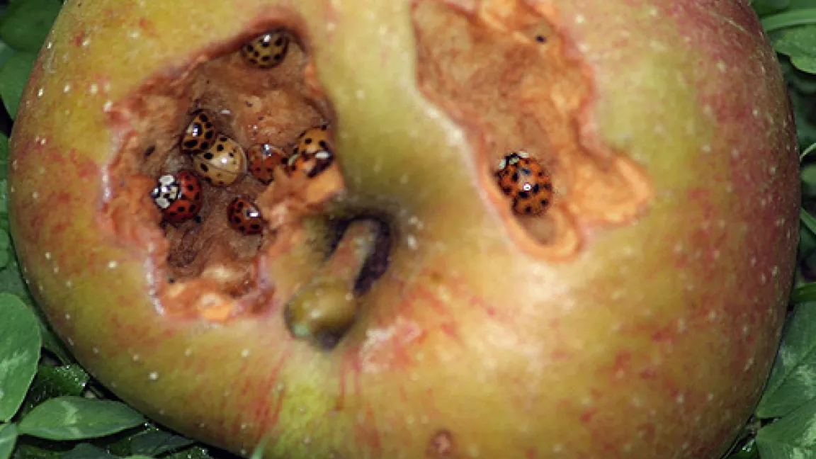 Jetzt werden die ersten Äpfel geerntet. Dabei ist Vorsicht geboten, denn manche Äpfel enthalten eine unliebsame Überraschung. Ursprünglich sollte sich der Asiatische Marienkäfer als unbändiger Läusefresser auch in Europa nützlich machen. Inzwischen hat er sich hier massenhaft vermehrt und ausgebreitet. So ist er zum Konkurrenten oder sogar zum Feind heimischer Marienkäfer geworden. Lästig ist, dass er mit Beginn der kalten Jahreszeit in ganzen Schwärmen auch in Häuser und Wohnungen einfällt. Auch Apfelbäume und ihre Früchte scheinen es ihm angetan zu haben.Die Apfelernte bringt es an den Tag: In manchen großräumig ausgehöhlten Äpfeln halten sich dutzendweise Marienkäfer auf. Die Fraßstellen sehen aus als knabberten sich die Käfer regelrecht in die Früchte hinein. Die ungebetenen Mitesser waren Asiatische Marienkäfer, erkennbar an der typischen einem W oder M ähnelnden Zeichnung auf ihrem Halsschild. Ein Ärgernis waren sie früher schon in einer anderen süßen Umgebung: in Weintrauben. Zur Weinlese 2007 hatten sie sich im Osten und Norden Frankreichs in solchen Massen in den Trauben verkrochen, dass sie nicht komplett entfernt werden konnten. Beim Keltern der Beeren wurde ihre bitter schmeckende Körperflüssigkeit frei, die so genannte Hämolymphe. Die Käfer sondern sie ab, wenn sie von natürlichen Feinden bedroht werden. Der Traubensaft war nicht mehr zu genießen.