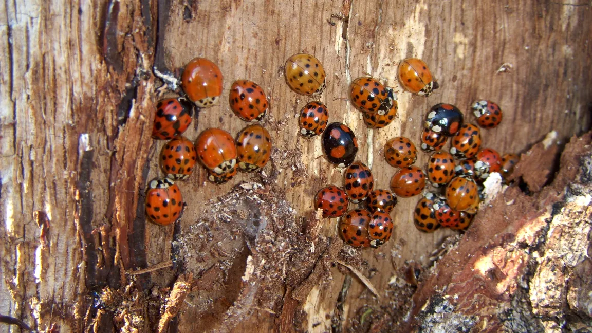 Der Asiatische Marienkäfer, Harmonia axyridis, ist als invasive Art in Europa inzwischen flächendeckend verbreitet. 2007 traten die orangefarbigen Käfer mit den vielen Punkten erstmals in Weinbaugebieten massenhaft auf. In den folgenden Jahren lehrten sie auch viele Hausbesitzer das Fürchten, überwinterten sie doch in Scharen in Kellern, wenig benutzten Hausarbeitsräumen oder anderen kühlen Zimmern. Sowohl der heimische als auch der Asiatische Marienkäfer sind als gefräßige Blattlaus- und Reblausvertilger bekannt und gelten in Wein, Obst und Getreide als Nützlinge.