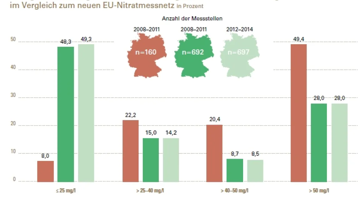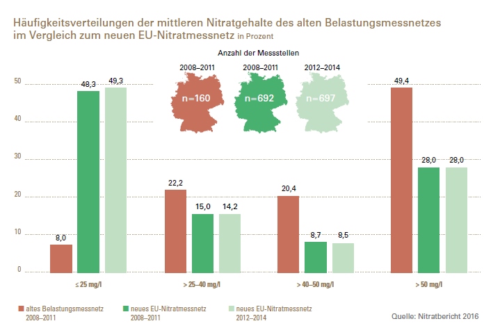Doch schon während der Neufassung tauchten die ersten Zweifel auf. Zum einen lagen nämlich nur die deutschen Beobachtungsbrunnen überwiegend in „Risikogebieten“. Also in Regionen mit hoher Viehdichte, intensivem Sonderkulturanbau oder sandigen – sprich durchlässigen – Böden. Sie sind deswegen nicht repräsentativ. Dies führte zu einer deutlichen Erweiterung der Messstellen und folglich im aktuellen Nitratbericht 2016 zu einem besseren Abschneiden Deutschlands. Zum anderen ist unter Experten strittig, ob es für einen Grenzwert von 50 Milligramm Nitrat pro Liter Wasser überhaupt eine sachgerechte wissenschaftliche Begründung gibt. Nitrat ist in den bislang üblichen Mengen vermutlich harmlos.