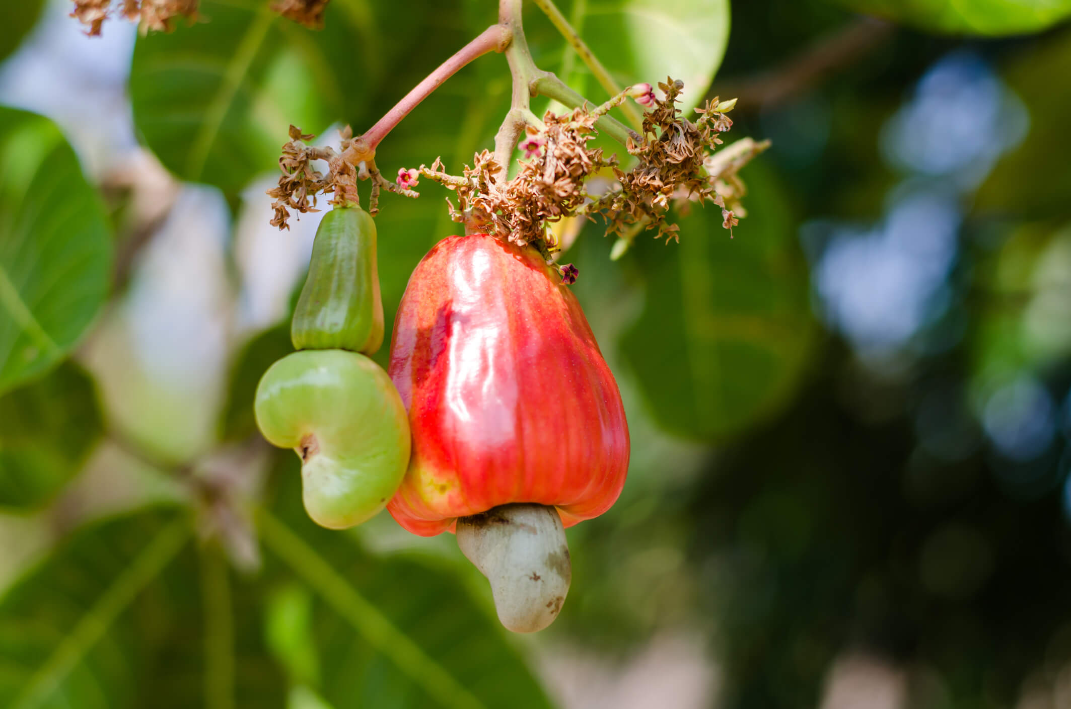 Der Cashewbaum (Anacardium occidentale) gehört wie die Pistazie und die Mango zur Familie der Sumachgewächse (Anacardiaceae) und wird auch Kaschu- oder Nierenbaum genannt. Der bis zu 15 Meter hohe Laubbaum wächst in tropischem Klima und eignet sich mit seinen Pfahlwurzeln sowie den zahlreichen Seitenwurzeln gut als Wind- und Erosionsschutz, ist tolerant gegenüber Nährstoffarmut und gelegentlicher Trockenheit. Bei allzu schlechten Standortbedingungen kann die Pflanze auch nur als Strauch wachsen. Ihre ausladende Krone trägt viele verzweigte Äste, die den Bäumen mitunter bizarre Formen verleihen. Die wechselständigen Blätter sind 15 bis 20 Zentimeter lang, eiförmig und ledrig-derb. An reich verzweigten Rispen sitzen winzige weiße bis rötliche Blüten, die entweder männlich oder zweigeschlechtlich sind und durch kleine Insekten oder den Wind bestäubt werden.