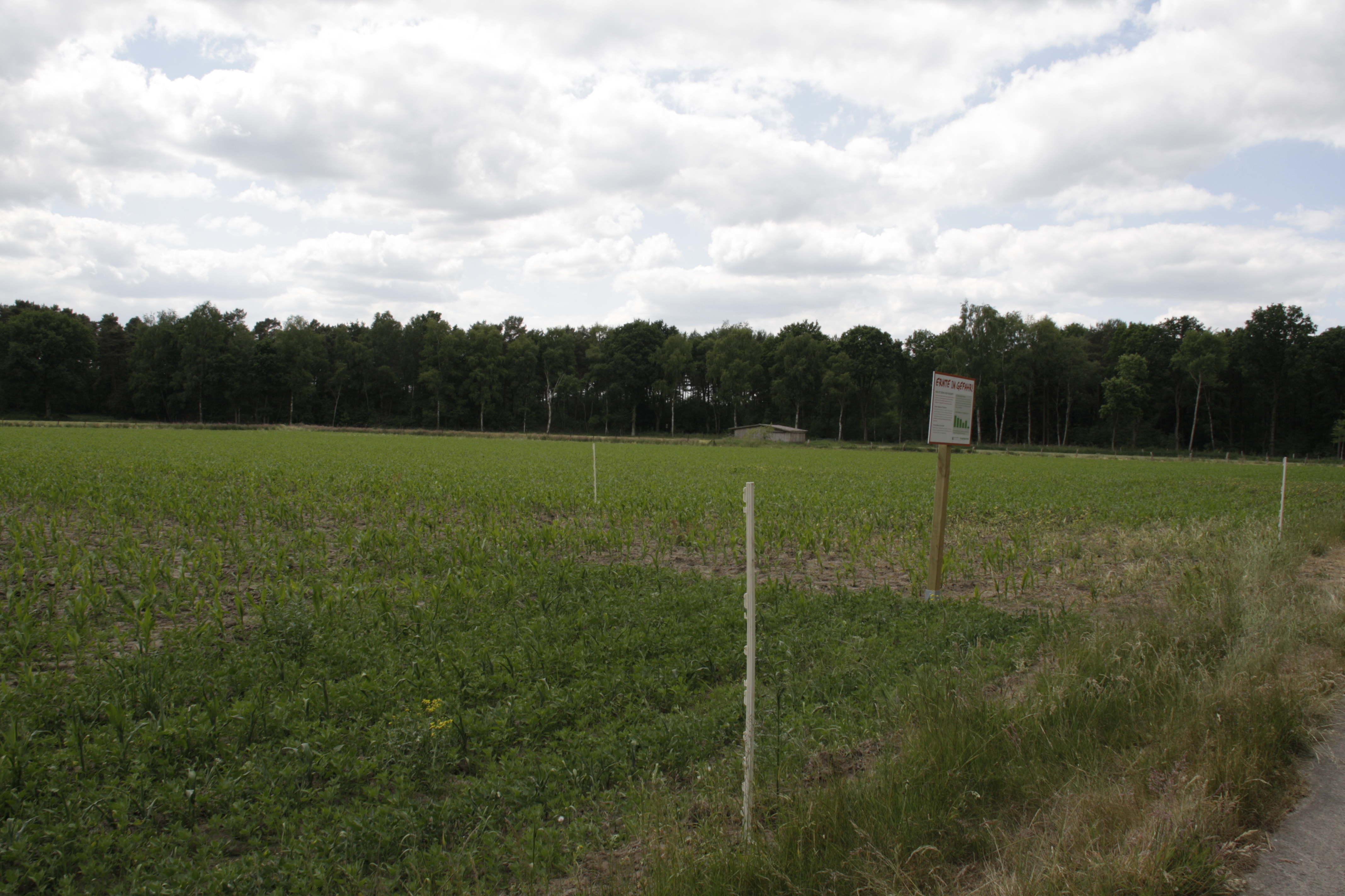 Ich habe eine Maisfläche ausgewählt. Man sieht beim Mais sehr schön, was passiert, wenn nichts passiert. Der Mais hat eine langsame Jugendentwicklung, das bedeutet, die Beikräuter und Gräser wachsen schneller als die Maisblätter und überwuchern ihn rasch. Ein weiterer Grund ist, dass die Fläche direkt an einem Radweg an der Bundesstraße 214 liegt. So können viele Leute das Hinweisschild sehen und wir erreichen damit eine breite Öffentlichkeit.