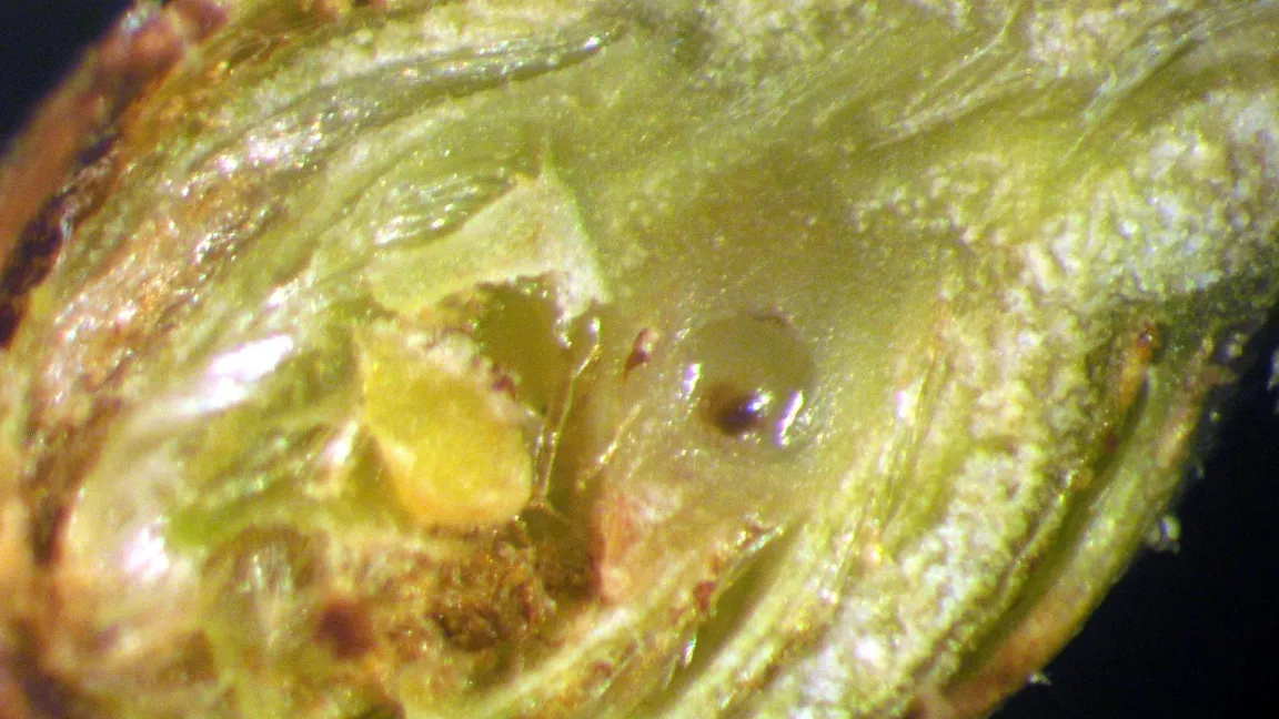 Die weißlichen Larven überwintern in den Knospen. Foto: forestryimages.com