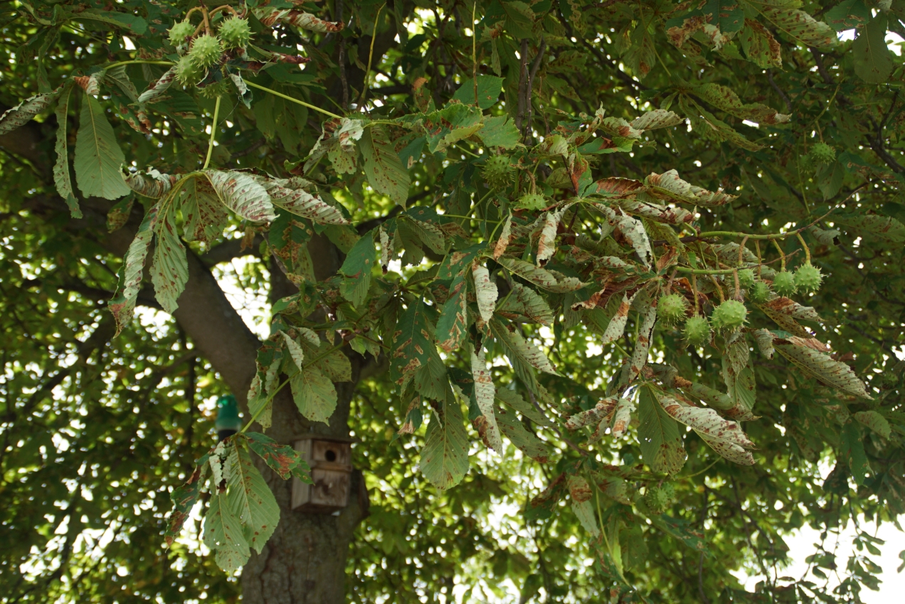 Ein großer Schädling für den Baum ist die Rosskastanienminiermotte. Die befallenen Blätter fallen schon sehr früh im August ab. Zum Teil treiben dann die Kastanien wieder aus und es kommt zu einer zweiten Blüte, der „Angstblüte“ im September. Singvögel wie die insektenfressenden Blau- und Kohlmeisen, Brackwespen und einige Schlupfwespen sind natürliche Feinde der Miniermotte. Auch Haushühner sind gute Insektenvertilger, allerdings sind sie heutzutage eher nicht mehr im öffentlichen Raum anzutreffen. Da die Puppen der Miniermotte im Laub überwintern, sollte das Falllaub eingesammelt und verbrannt oder mit einer Kompostiermethode mit mindestens 40 Grad Celsius kompostiert werden.