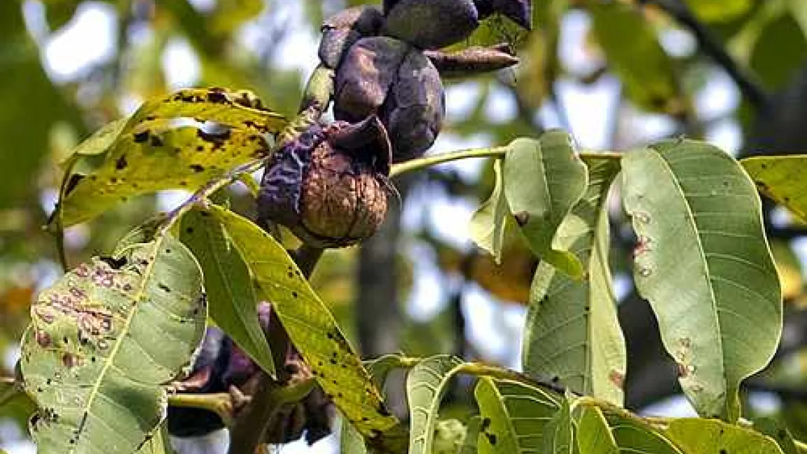 Zwei der wichtigsten Krankheitserreger an Walnussbäumen sind ein Bakterium Pseudomonas juglandis und ein Pilz Marssonina juglandis. Beide rufen ähnliche Symptome hervor. Sie können auch in die schwarz-braun verfärbten Nüsse eindringen und die Frucht zerstören. Eine Bekämpfung mit Pflanzenschutzmitteln ist nicht möglich. Um eine Ansteckung im nächsten Frühjahr zu verhindern, müssen fleckiges Laub und kranke Früchte nicht mit dem Kompost oder der Biotonne, sondern mit dem Restmüll entsorgt werden.